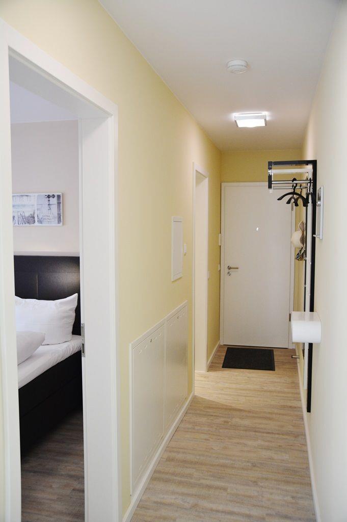 Küchenzeile (Mikrowelle, 2-Platten-Ceranfeld) sowie einem Duschbad mit WC. Die Wohnung bietet zwei Balkone: einen, den man von Wohnzimmer und Schlafzimmer aus betritt und einen weiteren kleinen, der auch vom Wohnbereich aus zu erreichen ist. Sie befindet sich im 1. Obergeschoss, ein Aufzug ist vorhanden. Es handelt sich um eine Nichtraucherwohnung.