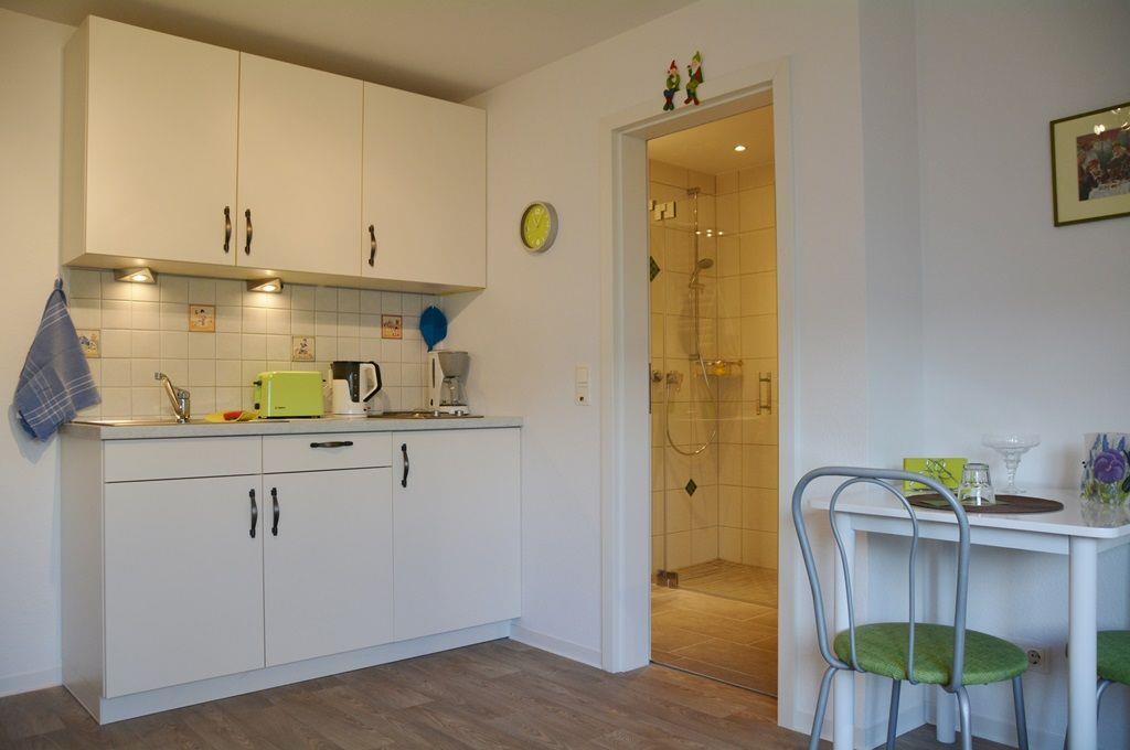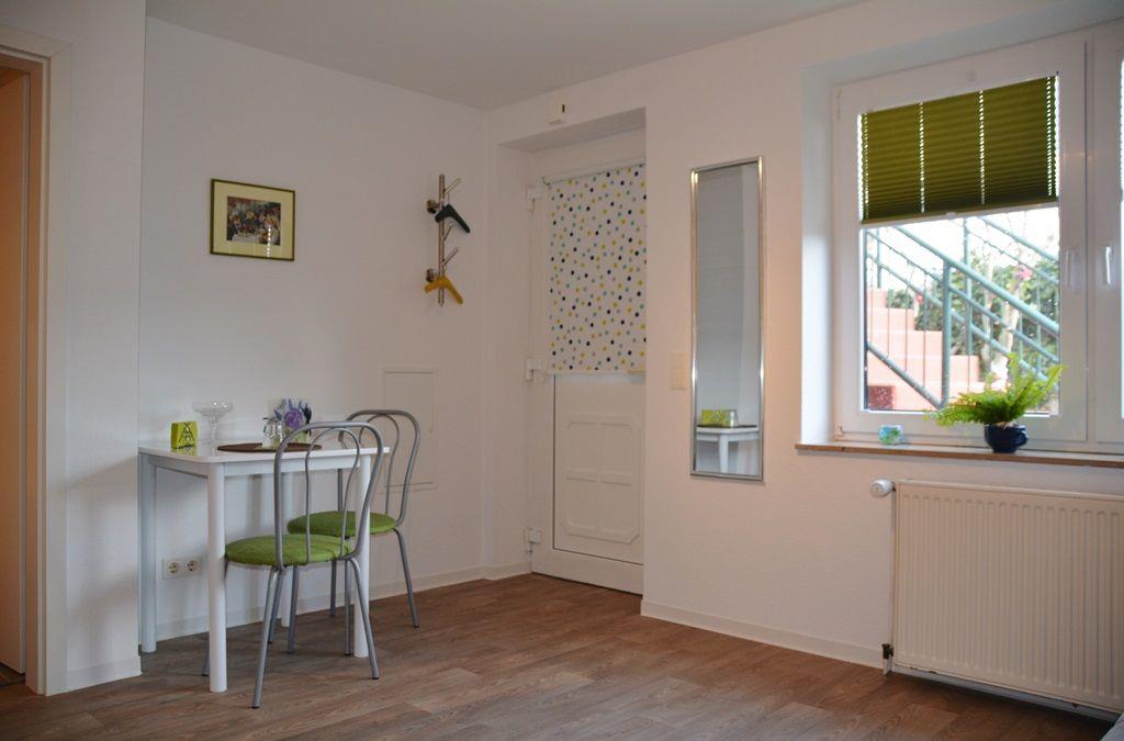 Das Single-Appartement liegt im Erdgeschoss und besteht aus einem Raum mit Schlafsofa (ca. 1,20 m x 1,90 m), TV, Essbereich und integrierter Küchenzeile (2-Platten-Kochfeld, Gefrierfach). Ein komplett saniertes Duschbad mit WC gehört zur Wohnung (Dusche ebenerdiger Einstieg, WC leicht erhöht). WLAN. Kleiner Außensitzplatz vorhanden. Fahrräder können gegen Gebühr beim Eigentümer ausgeliehen werden. Nichtraucherwohnung!