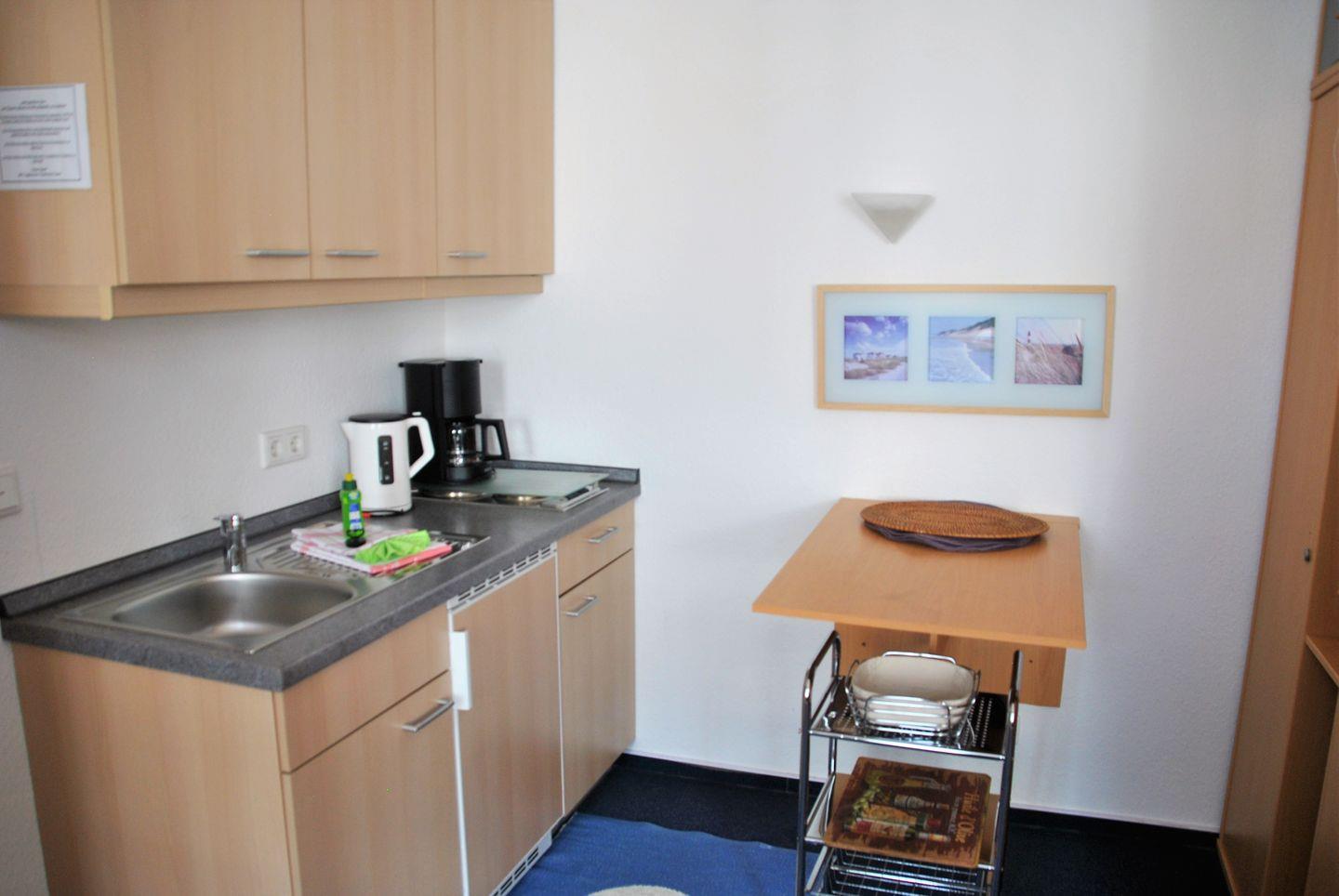 Das 2-Raum-Appartement in der 1. Etage verfügt über ein separates Schlafzimmer mit Doppelbett, Wohnraum mit TV, Küchezeile (2-Plattenherd,Kühlschrank) Essecke und Dusche/WC. WLAN im Haus, NICHTRAUCHERWOHNUNG!