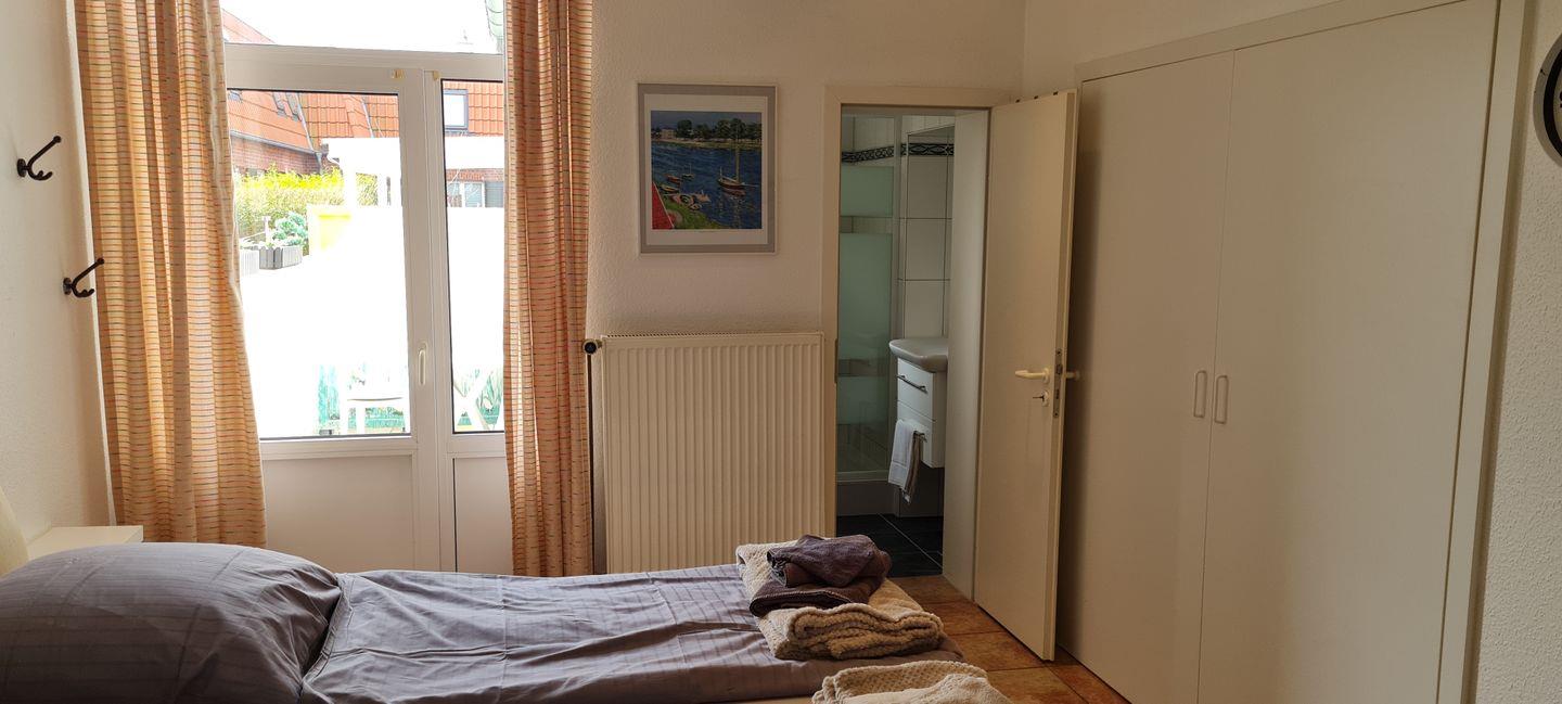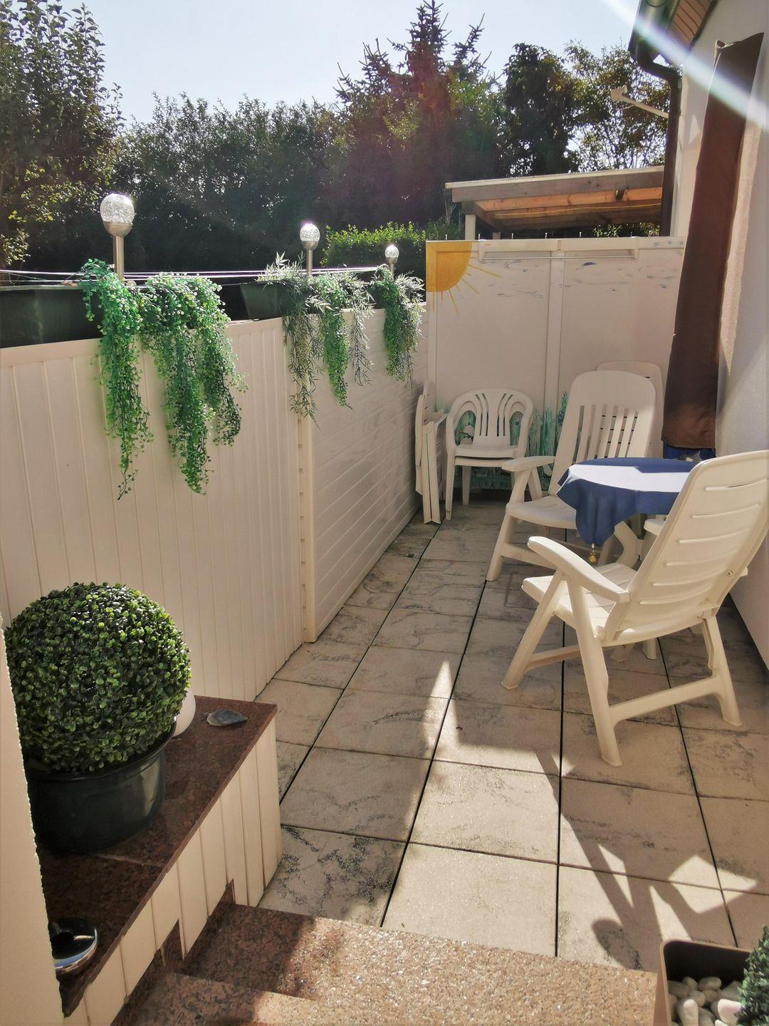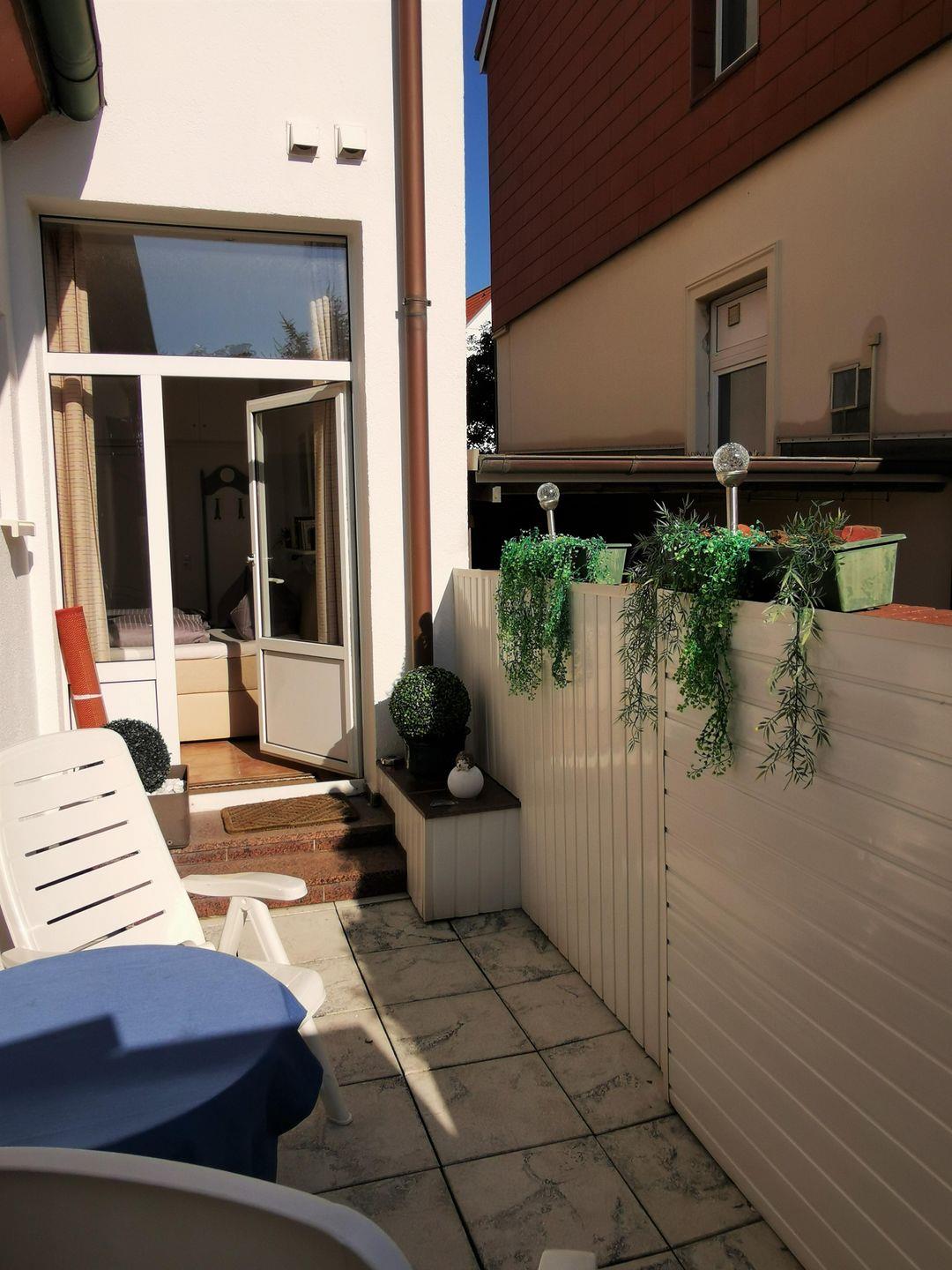 Die komfortable 2-Raum-Ferienwohnung in zentraler Lage verfügt über ein separates Schlafzimmer mit Doppelbett (TV), Badezimmer mit Dusche/WC, Wohn-/Schlafraum (Schlafsofa) mit Küchenzeile (Ceranherd, Mikrowelle, Spülmaschine) und Essbereich sowie Gäste-WC. Die nach Südwest ausgerichtete Terrasse lädt zum 'Frühstück im Freien' oder zum Entspannen ein. NICHTRAUCHERWOHNUNG!