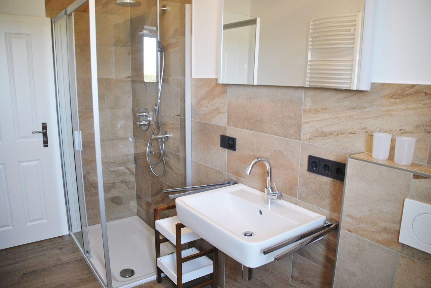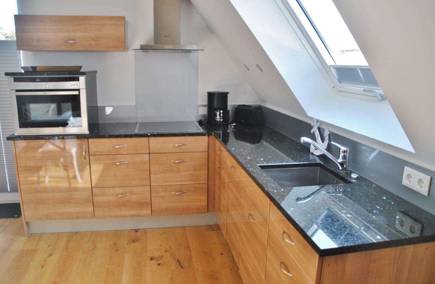 Küchenzeile (Spülmaschine, Backofen, Cerankochfeld) aus handgefertigten Möbeln sowie Zugang zu einem Südbalkon, ein Schlafzimmer mit Boxspringbett (TV) und einem Badezimmer mit Dusche/WC. Gäste WC vorhanden. WLAN. NICHTRAUCHERWOHNUNG!