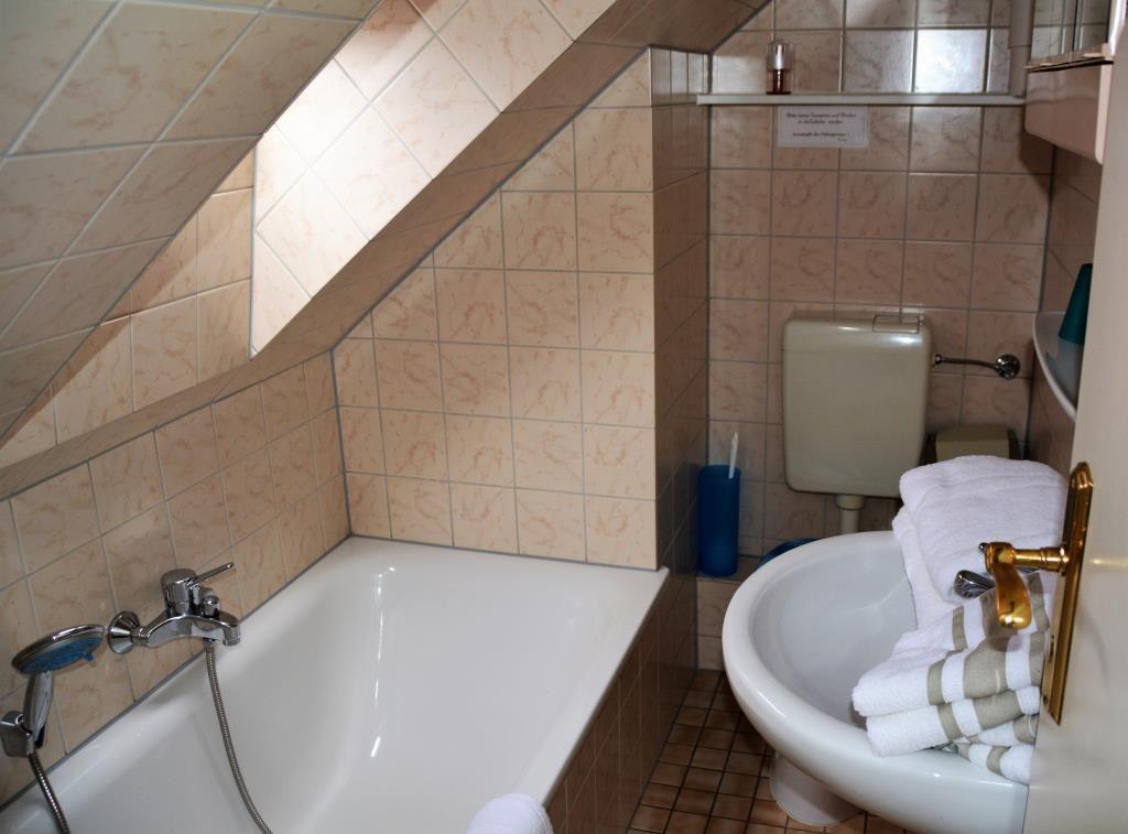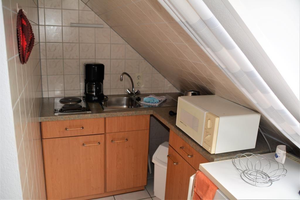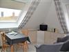 Das kleine 1-Raum-Appartement im Dachgeschoss (!!! Dachschrägen, niedrige Deckenhöhe) verfügt über einen Wohn-Schlafraum mit zwei Einzelbetten, Wohnküche mit Essecke (TV) sowie Badezimmer mit Duschwanne/WC. Terrasse und PKW Abstellplatz am Haus.