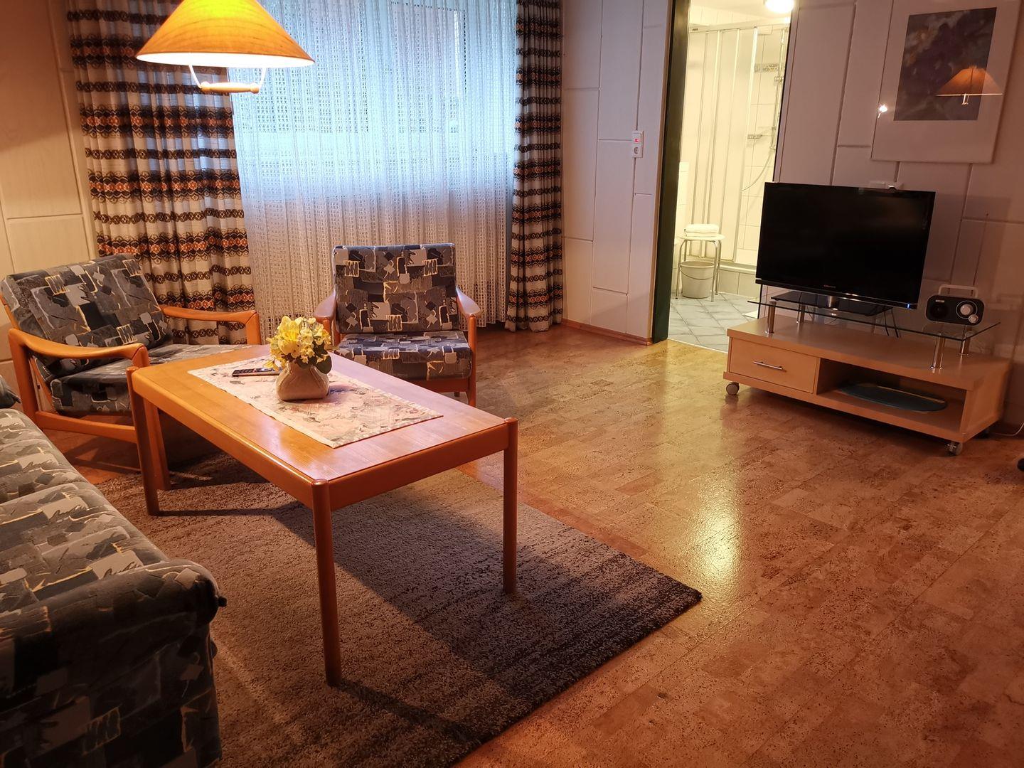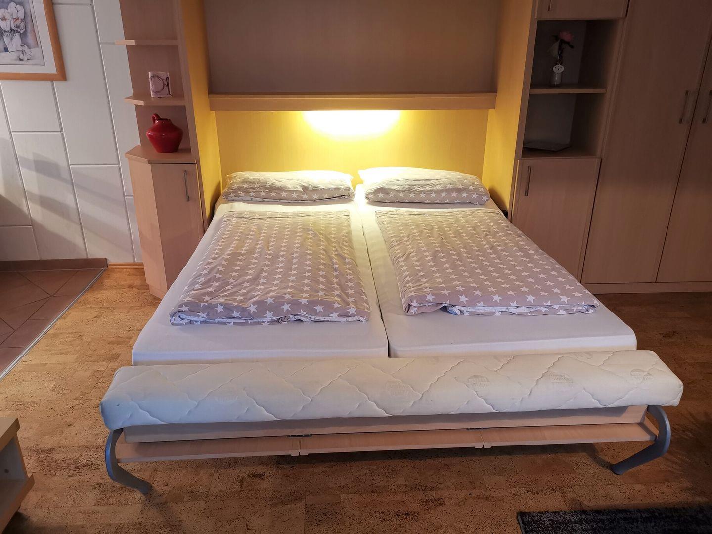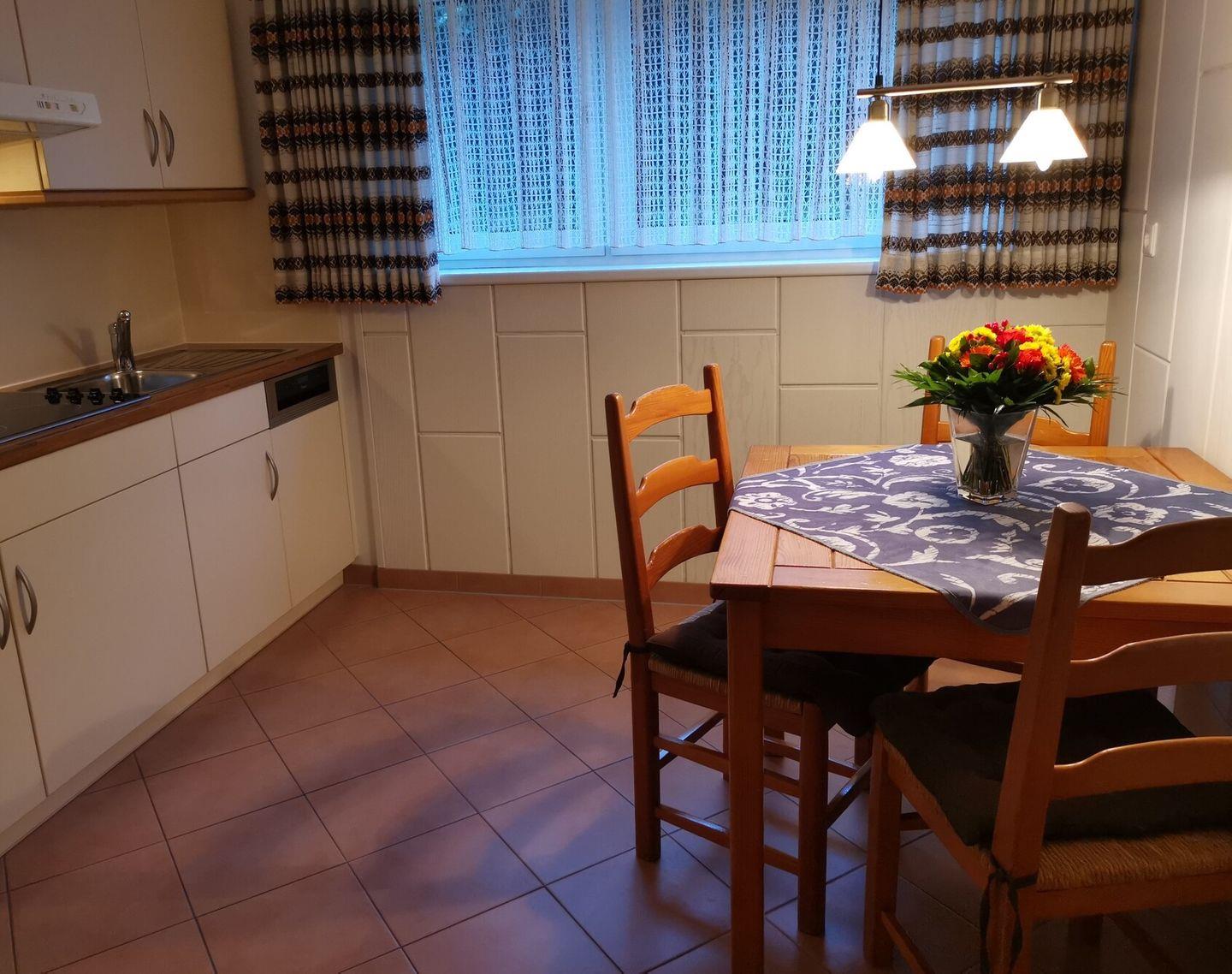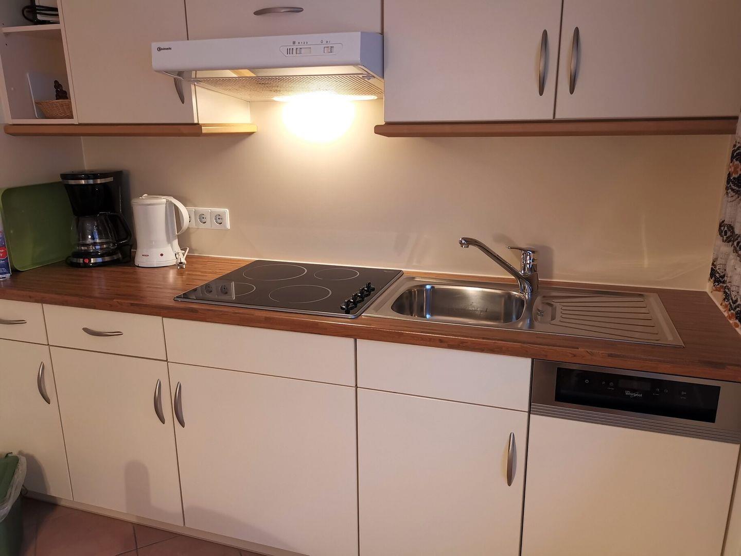 Die 1-Raum-Ferienwohnung im Souterrain verfügt über ein Wohn-/Schlafraum mit Doppel-Schrankbett (TV), Küchenzeile (Mikrowelle; Spülmaschine) mit Essbereich sowie Badezimmer mit Dusche/WC.