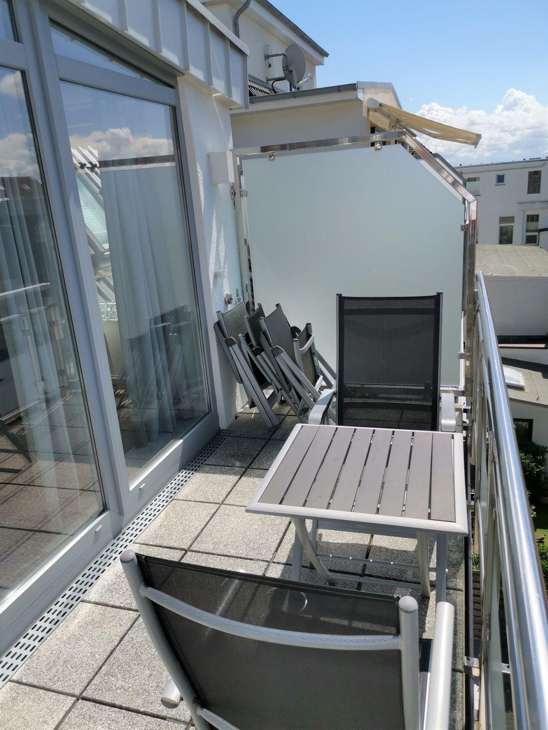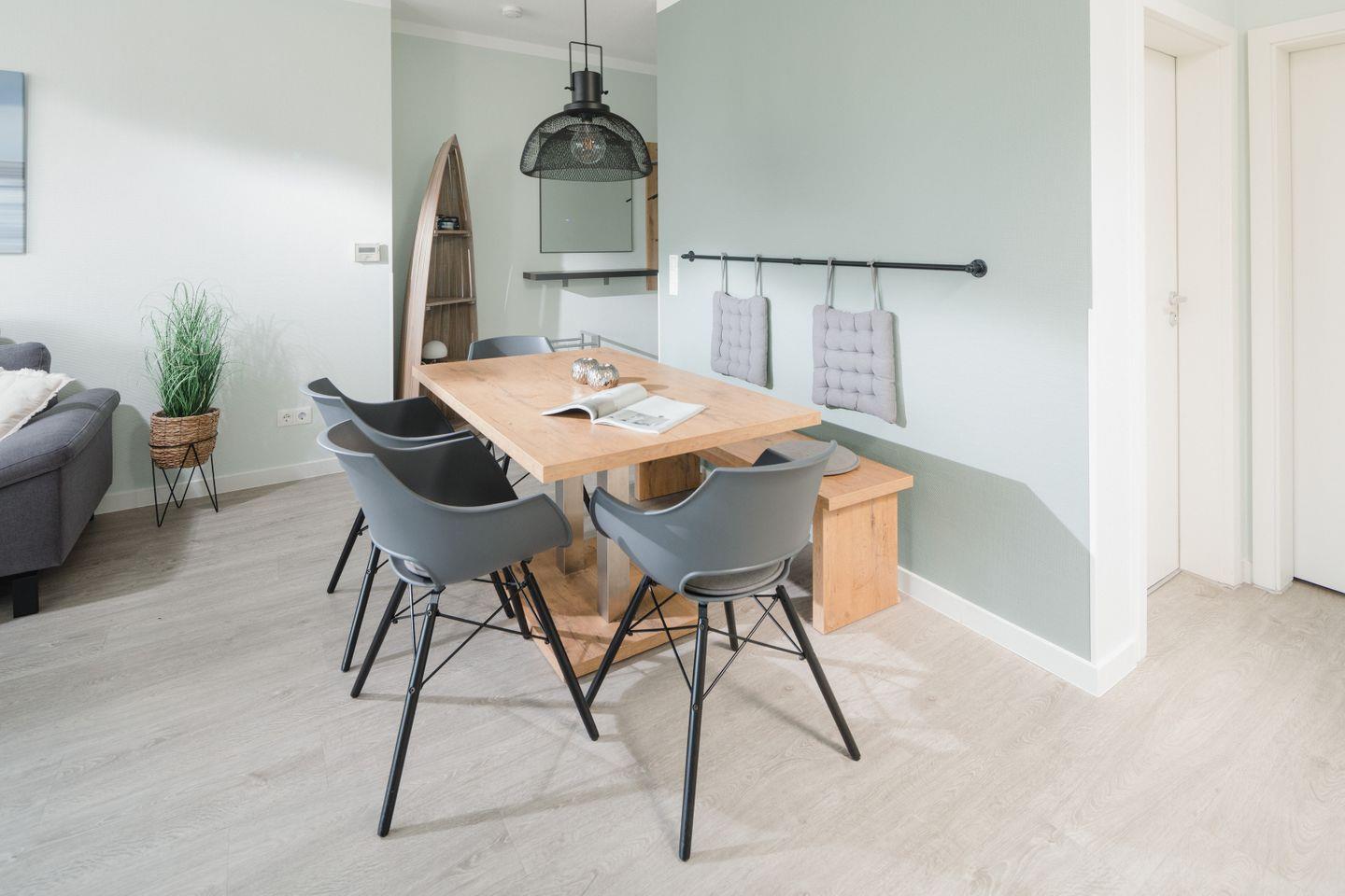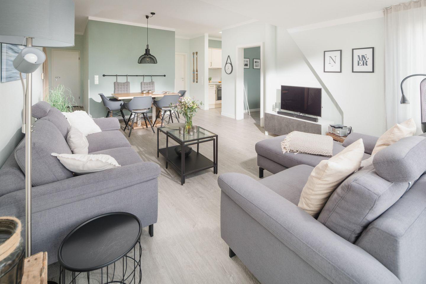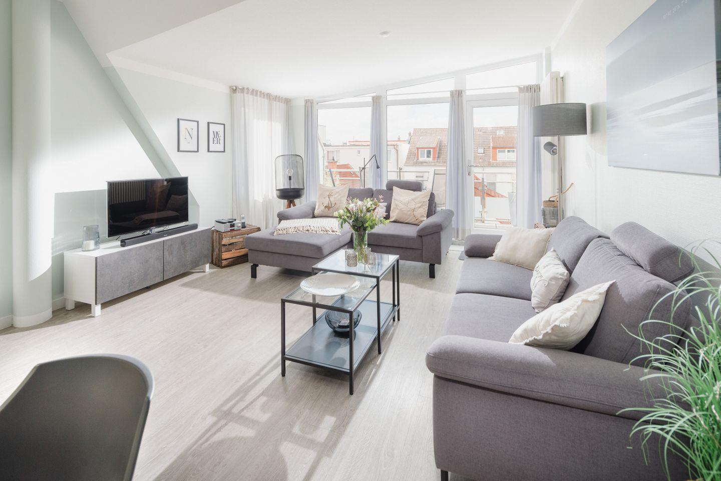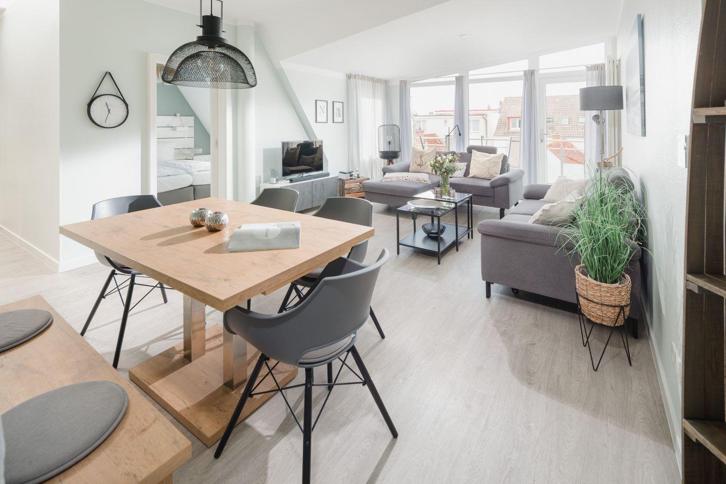 Ihr Feriendomizil, die "Sonne 12", befindet sich im darüberliegenden DG. Durch den Flur, mit reichlich Platz für Ihre Garderobe, gelangen Sie in den großzügigen, luftigen und sonnendurchfluteten Wohn/Essbereich mit Zugang zum nach Süd/West ausgerichteten Balkon. Der moderne & bequeme Wohnbereich verfügt außerdem über modernste Fernsehunterhaltung (LG Smart-TV mit zahlreichen Apps wie Netflix, Amazon Prime, SkyQ u.v.m.).