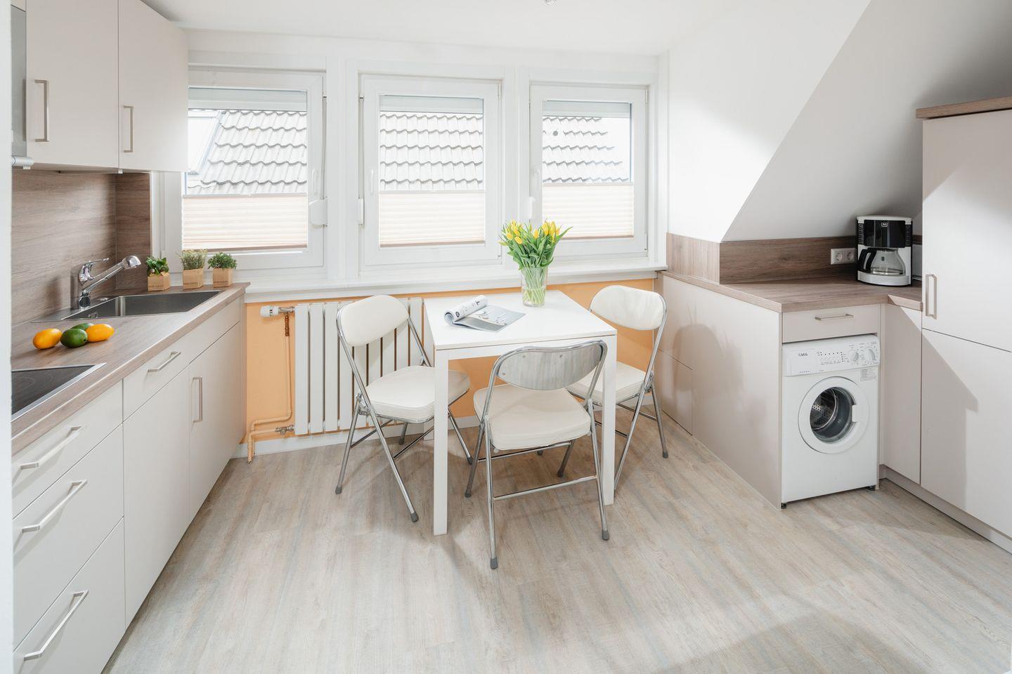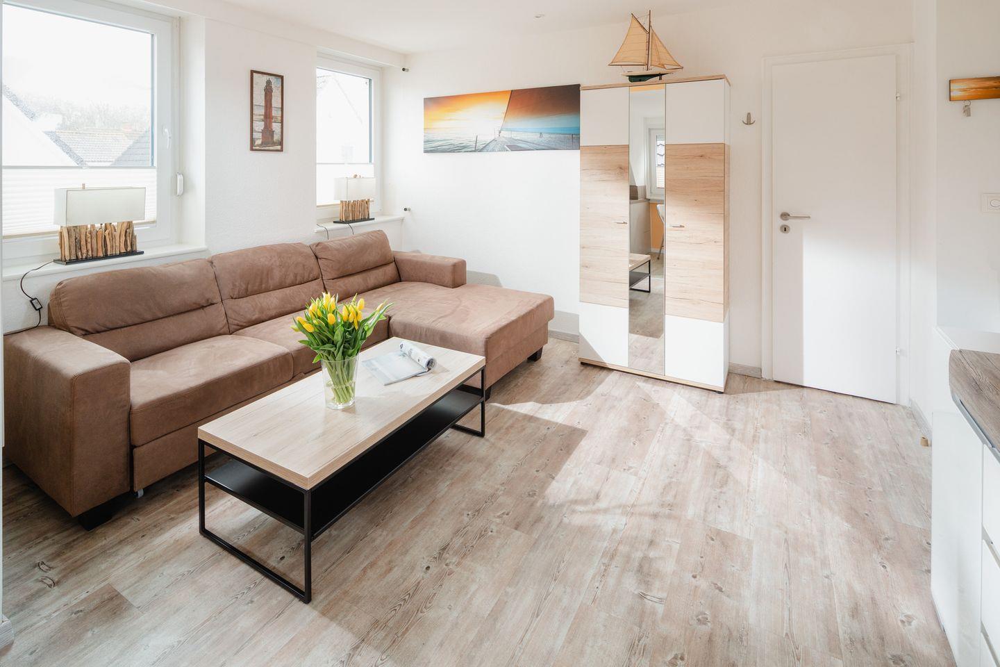 Die Ferienwohnung Paula ist ca. 30qm² groß und befindet sich im 1. OG. Sie verfügt über einen gemütlichen Wohnraum mit Sitzecke, gut ausgestatteter Küche (Cerankochfeld, Backofen) mit Essplatz, separates Schlafzimmer mit Doppelbett sowie Badezimmer mit Dusche und WC. Waschmaschine vorhanden.