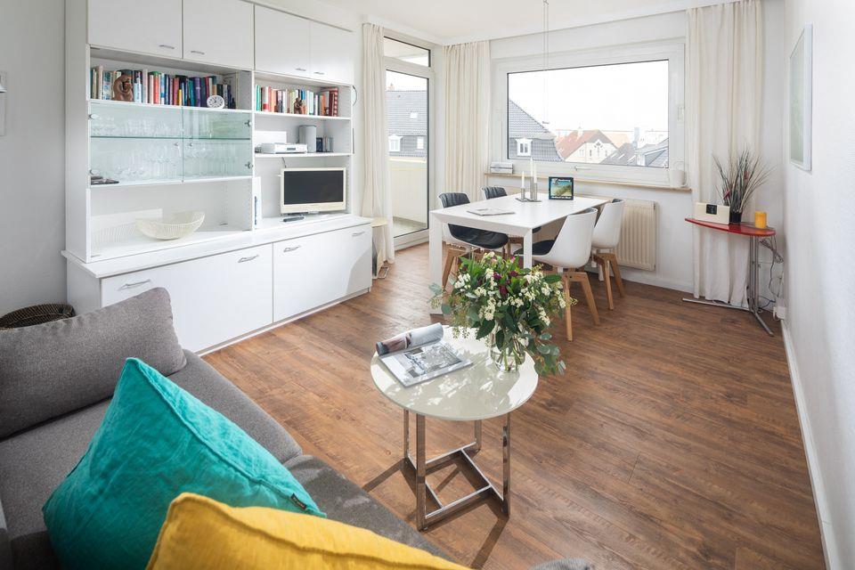 Die helle, renovierte 2-Raum-Ferienwohnung (ca.35qm²) in der 3. Etage verfügt über ein separates Schlafzimmer mit Doppelbett, einen Wohn-Schlafraum (komfortables Faltsofa) mit Essecke (Smart-TV, Bluetooth-Radio), separate Küche (4-Plattenherd, Spülmaschine, Mikrowelle, Nespressomaschine) und Badezimmer mit Dusche/ WC. Im Badezimmer steht Ihnen eine Waschmaschine zur Verfügung.
