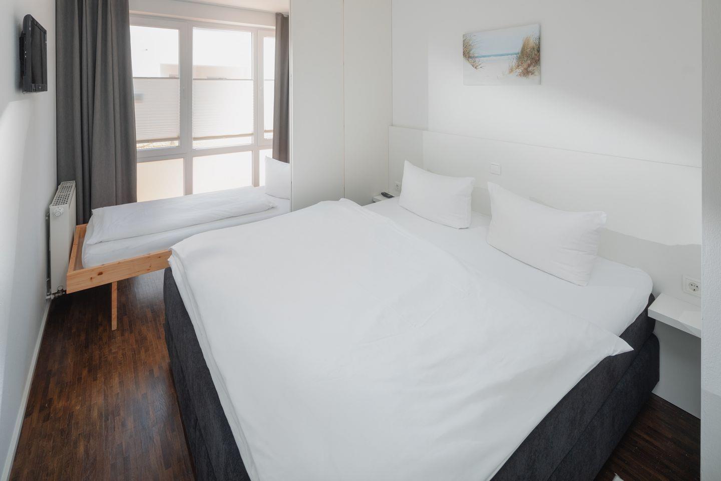 Im Erdgeschoss finden Sie zwei gemütliche Schlafzimmer. Das erste Schlafzimmer ist mit einem großzügigen Doppelbett der Größe 180x200cm ausgestattet, um Ihnen erholsame Nächte zu bescheren. Das zweite Schlafzimmer bietet mit einem Boxspringbett (180x200cm) und einem Schrankbett (90x200cm) flexible Schlafmöglichkeiten für bis zu drei Personen.