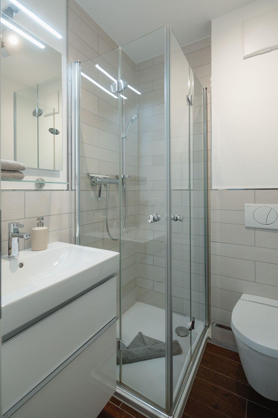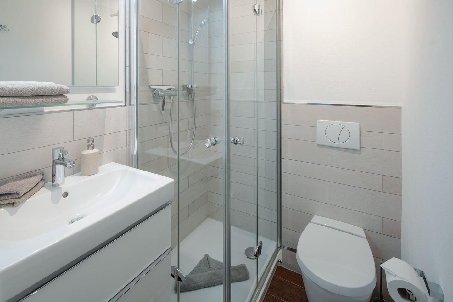Die beiden Badezimmer im Erdgeschoss sorgen für Komfort. Hier finden Sie nicht nur eine erfrischende Dusche, sondern auch alle Annehmlichkeiten, die Sie für Ihre tägliche Pflege benötigen.