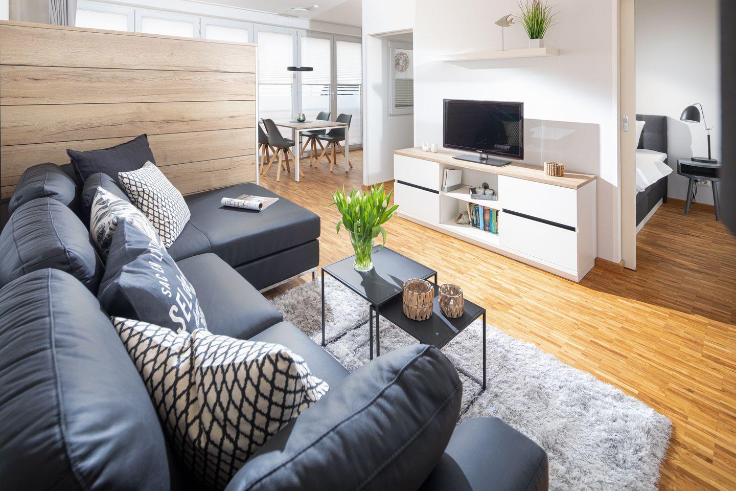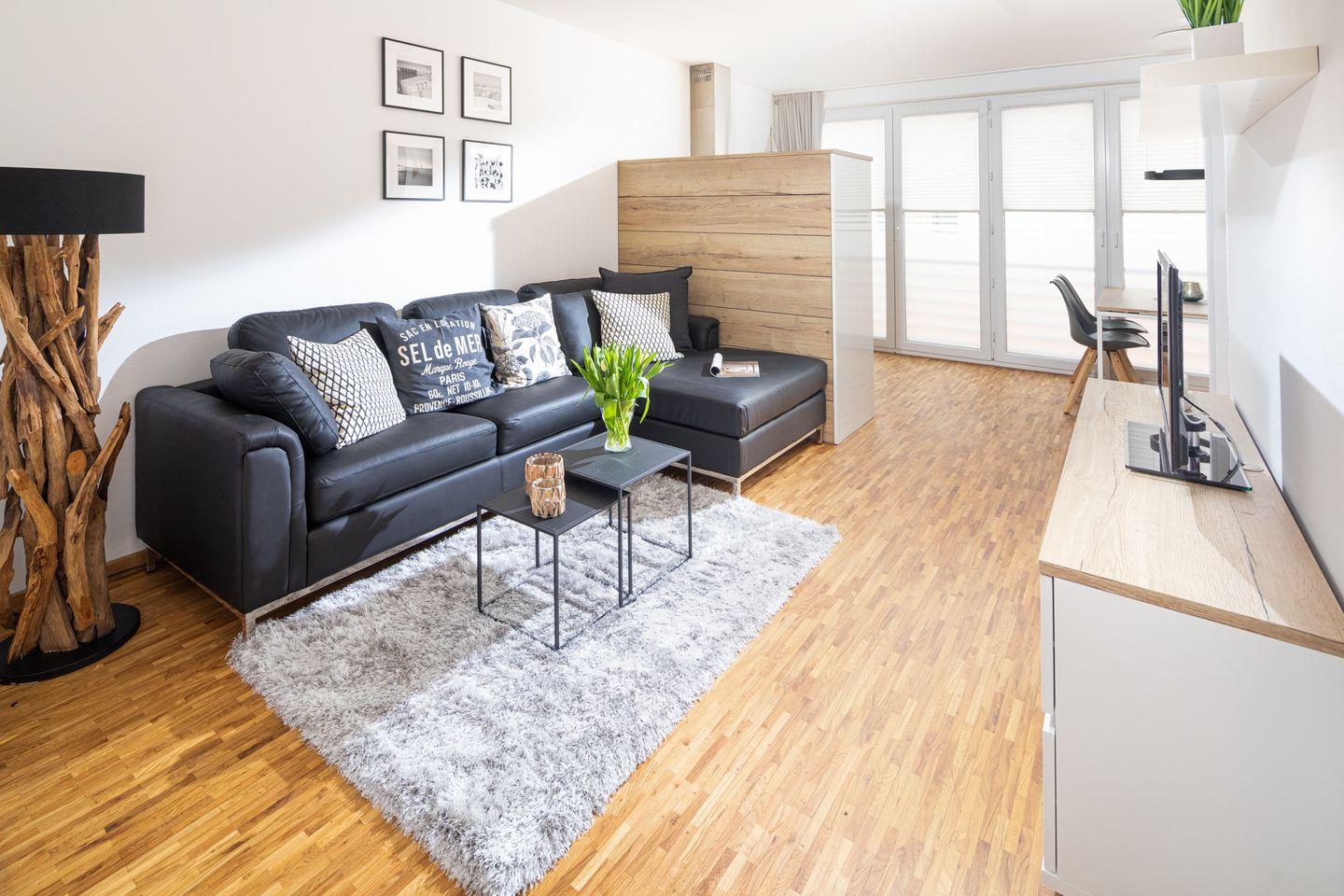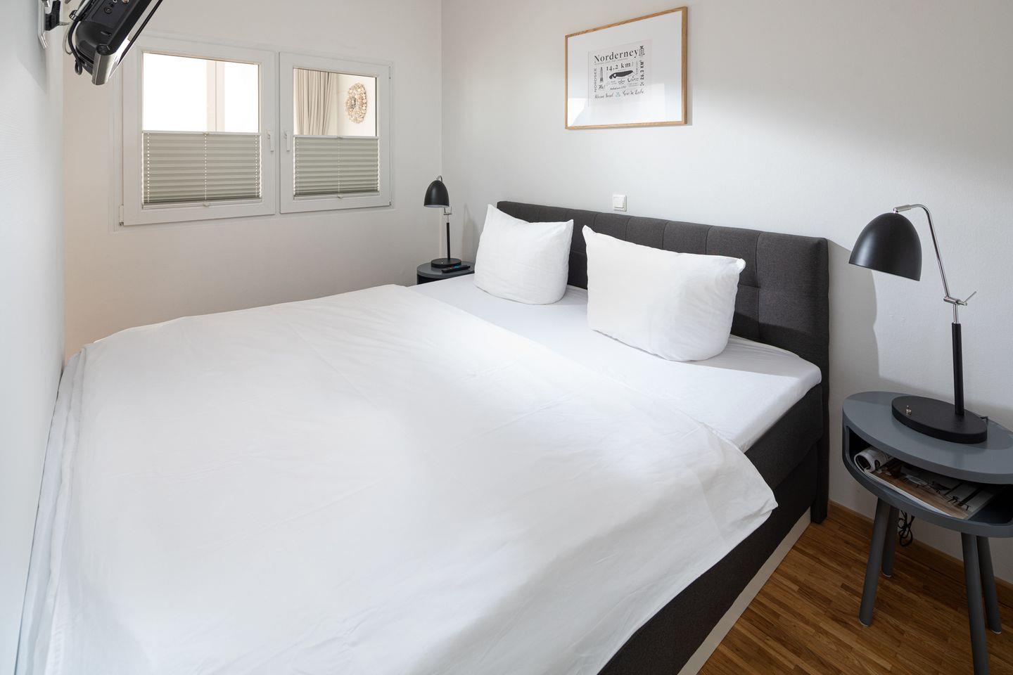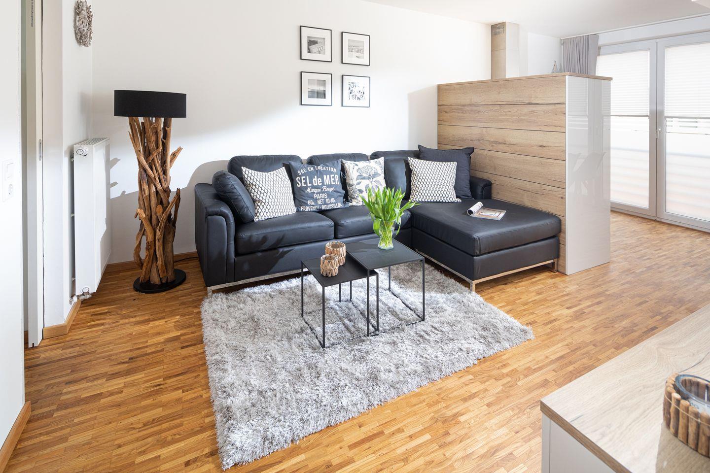 Gut 45 qm bieten Ihnen Raum zum komfortablen Urlaubswohnen. Besonders für Familien oder Paare, die Wert auf stilvolle Wohnqualität legen und kurze Wege ins Zentrum und zum Strand schätzen, ist unser Feriendomizil eine gute Möglichkeit, wundervolle Urlaubstage zu verbringen. Auch ein Reisebett und ein Hochstuhl stellen wir für die kleinen Gäste gern kostenlos zur Verfügung. Das Hochbett im zweiten Schlafzimmer ist nur für Kinder geeignet.