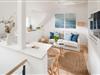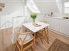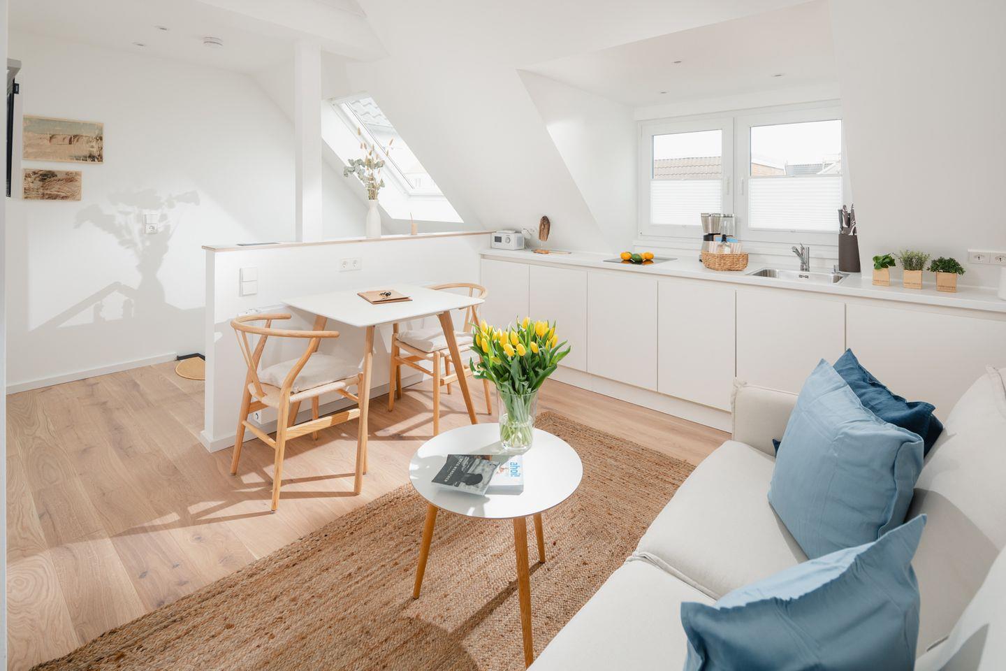 Der Wohnbereich empfängt Sie mit freundlichen Farben, klaren Linien und viel Tageslicht. Durch die Dachfenster wirkt der Raum offen und angenehm ruhig. Ein komfortables Sofa bildet den Mittelpunkt der Sitzecke – ideal zum Entspannen, Lesen oder für den Abend nach einem Tag am Strand. Der Esstisch fügt sich harmonisch ein und bietet ausreichend Platz für gemeinsame Mahlzeiten oder den ersten Kaffee am Morgen.