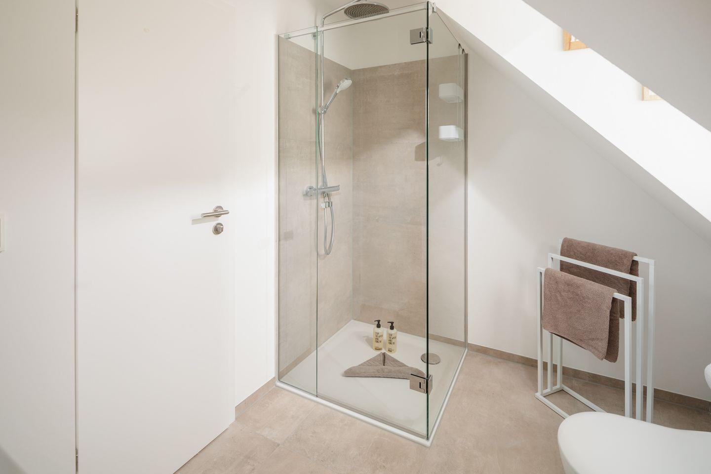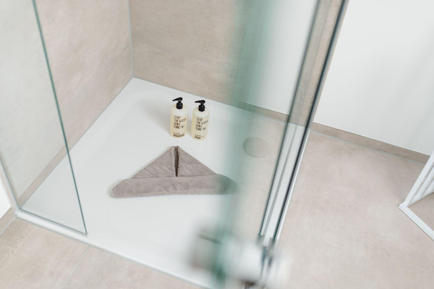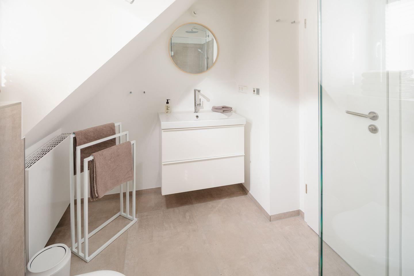 Das Bad wurde im Zuge der Sanierung komplett erneuert und ist entsprechend modern gestaltet. Die ebenerdige Dusche, klare Fliesen und hochwertige Armaturen sorgen für ein angenehmes Raumgefühl. Das Fenster eröffnet gute Lüftungsmöglichkeiten und bringt frische Helligkeit hinein.