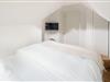 Das Schlafzimmer liegt angenehm geschützt unter dem Giebel. Das Boxspringbett (160×200 cm) bietet einen hohen Schlafkomfort. Der Raum ist durch klare Formen, helle Farben und passende Materialien geprägt. Durch das Fenster im Giebel gelangt Tageslicht in den Raum, wodurch eine freundliche und ruhige Atmosphäre entsteht.