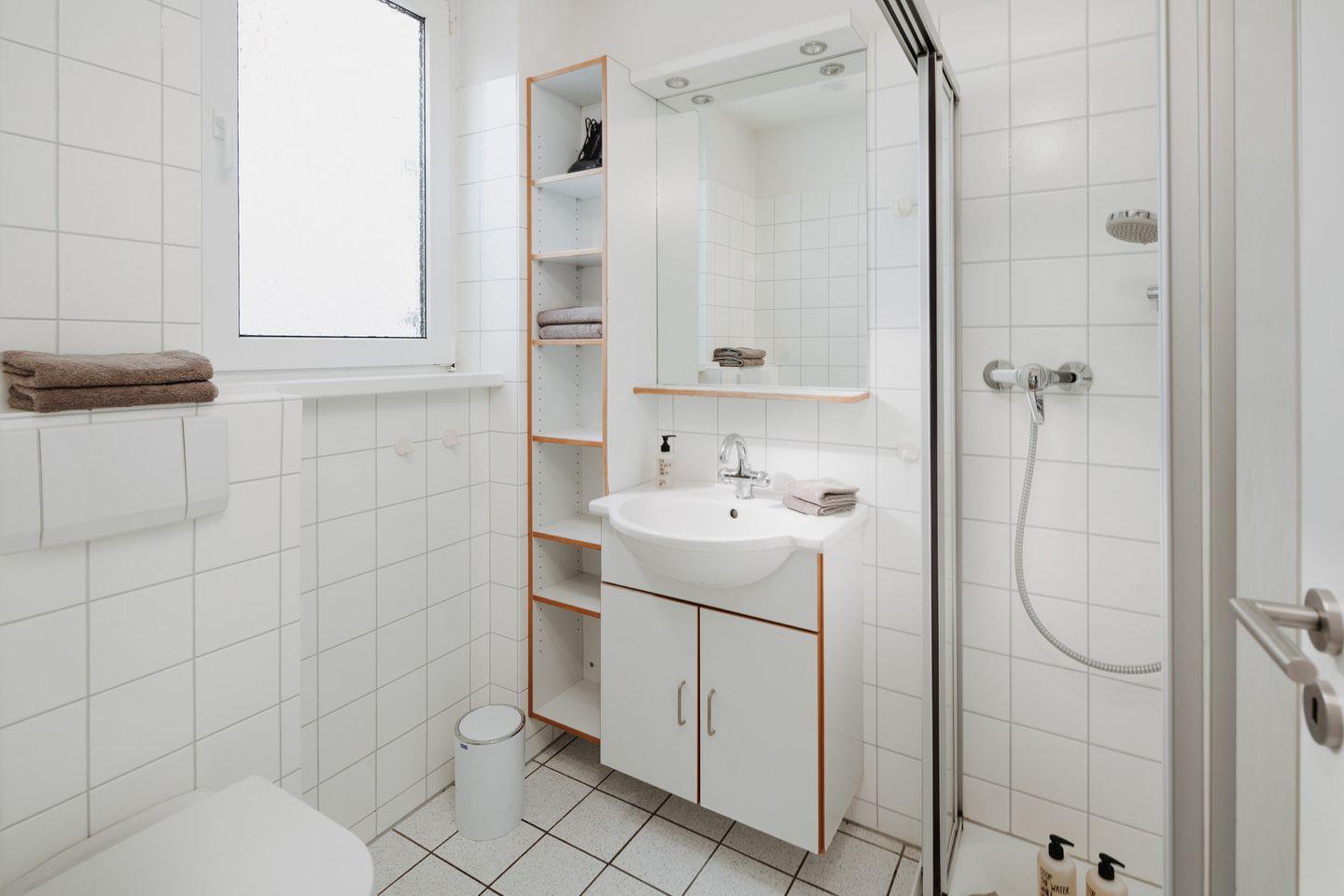 Das Apartment verfügt über ein kombiniertes Wohn- und Schlafzimmer, das mit einem komfortablen Boxspringbett der Größe 160x200cm ausgestattet ist. Das Badezimmer ,mit Fenster, ist mit einer Dusche, einem Waschbecken und Toilette ausgestattet.