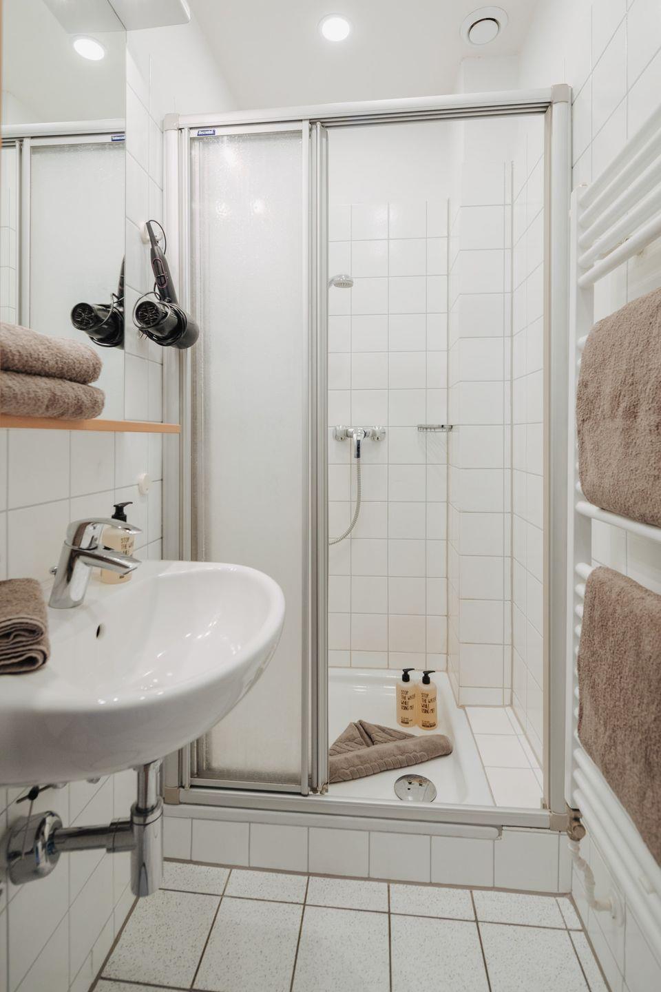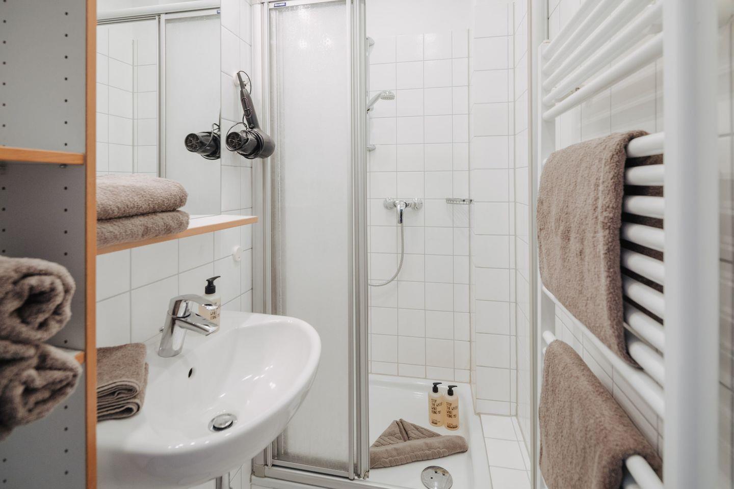 Die Wohnung verfügt über ein Schlafzimmer mit einem großzügigen Boxspringbett der Größe 180x200cm, das höchsten Schlafkomfort verspricht. Für die kleinen Gäste steht ein Etagenbett mit den Maßen 80x160 bereit, um einen erholsamen Schlaf zu gewährleisten. Das Badezimmer ist mit einer Dusche und einem Waschbecken ausgestattet. Das WC befindet sich separat.