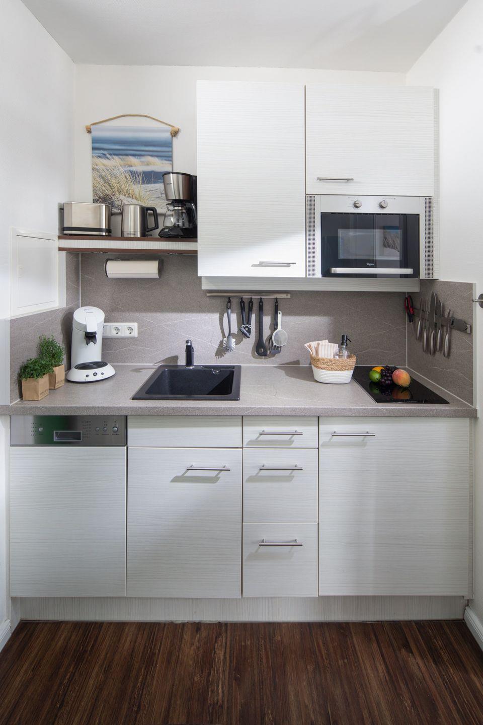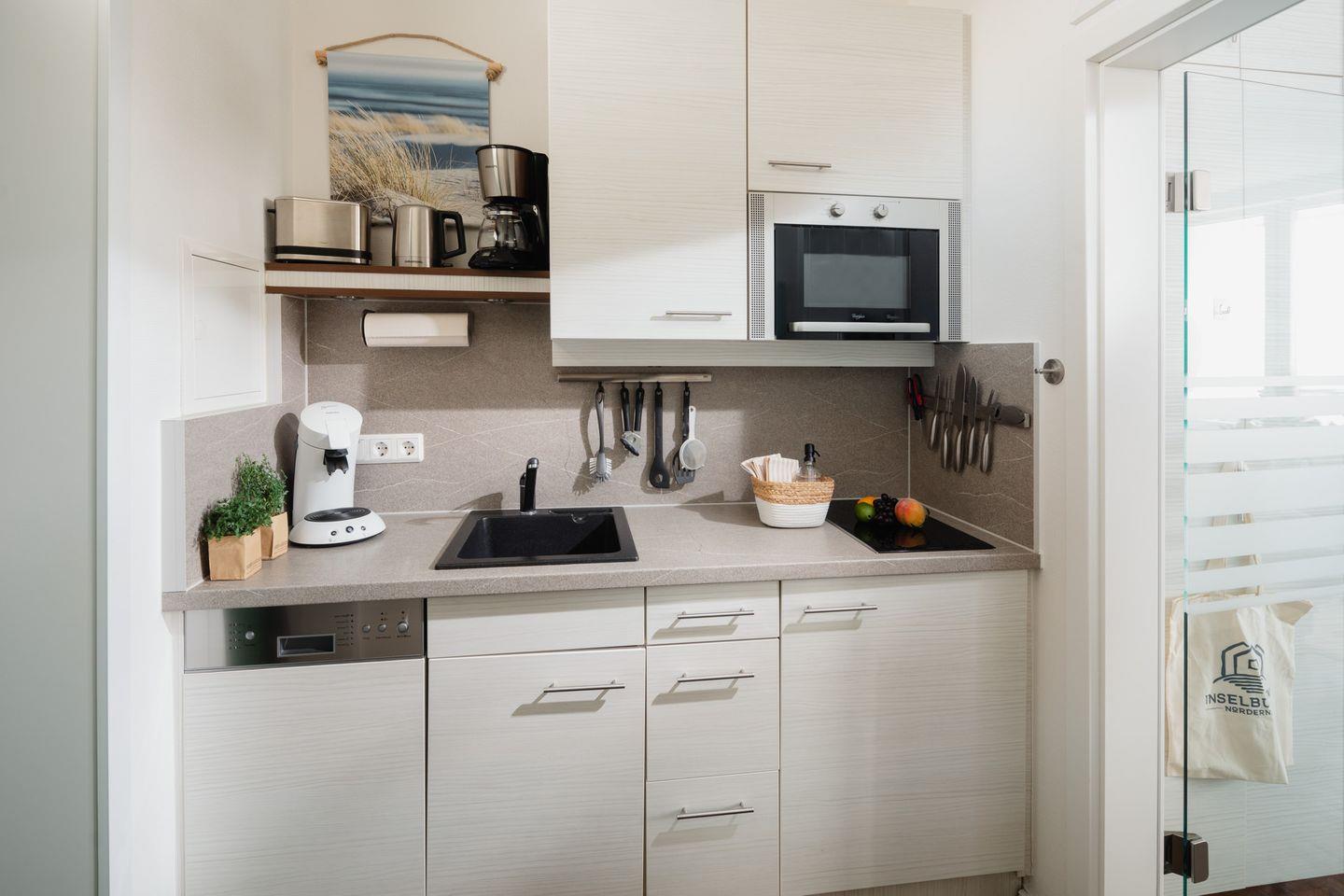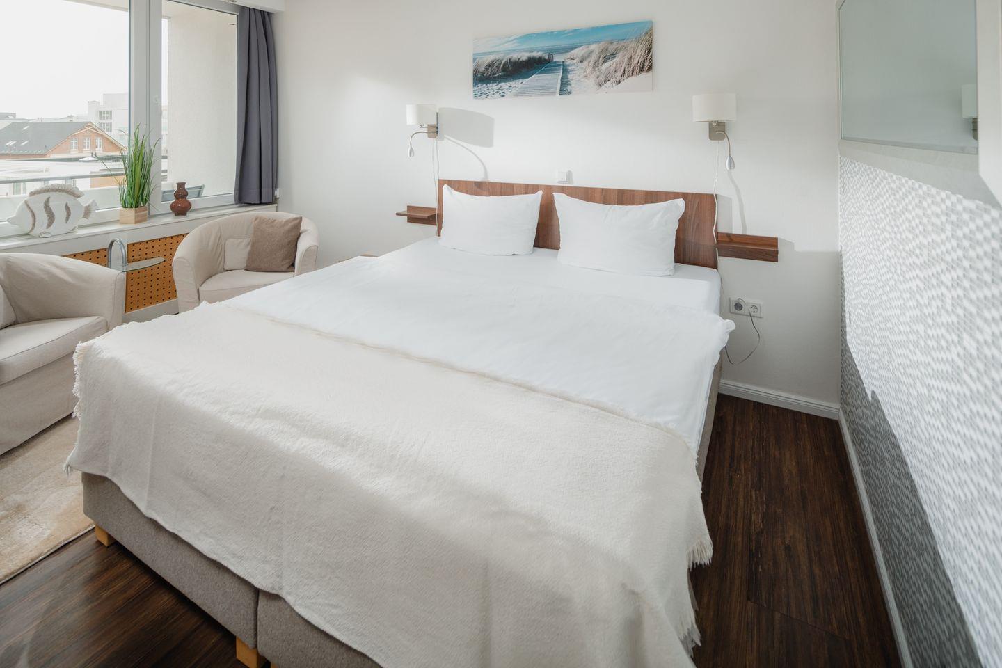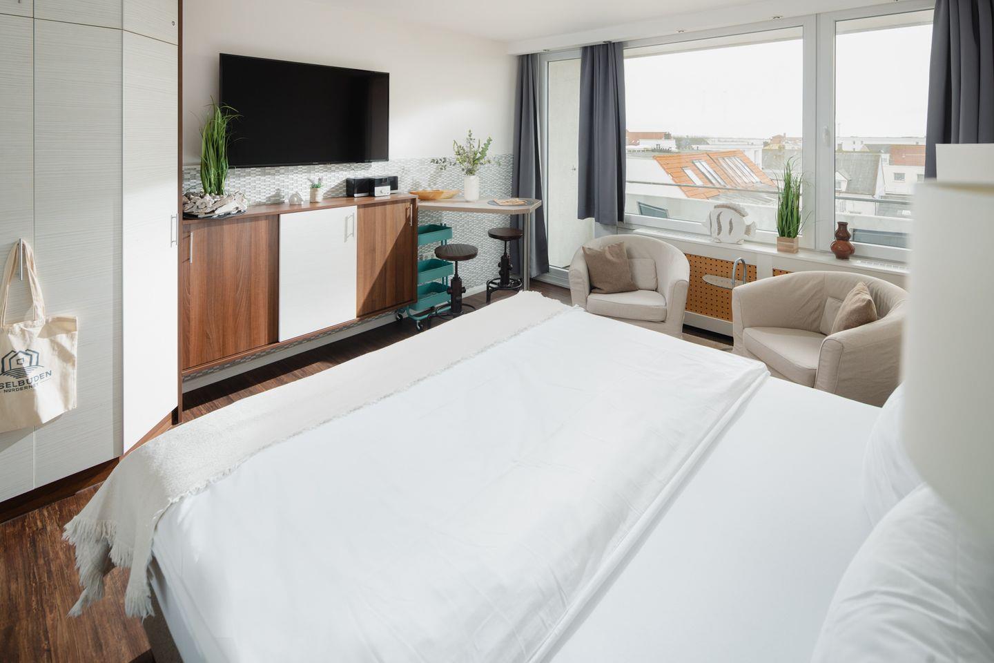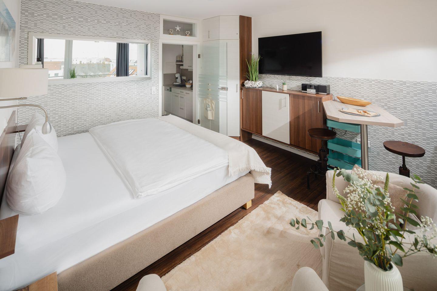 Mit dem Fahrstuhl in den 4. Stock, noch ein paar Stufen und schon sind Sie da. Jetzt kann der Urlaub beginnen. Auf 26qm urlauben Sie zu zweit. Ausgestattet mit einem Boxspringbett (180x200cm) und 2 Sesseln zum abendlichen Fernsehen schauen bietet die Wohnung Lüttje Leevke einen guten Komfort.