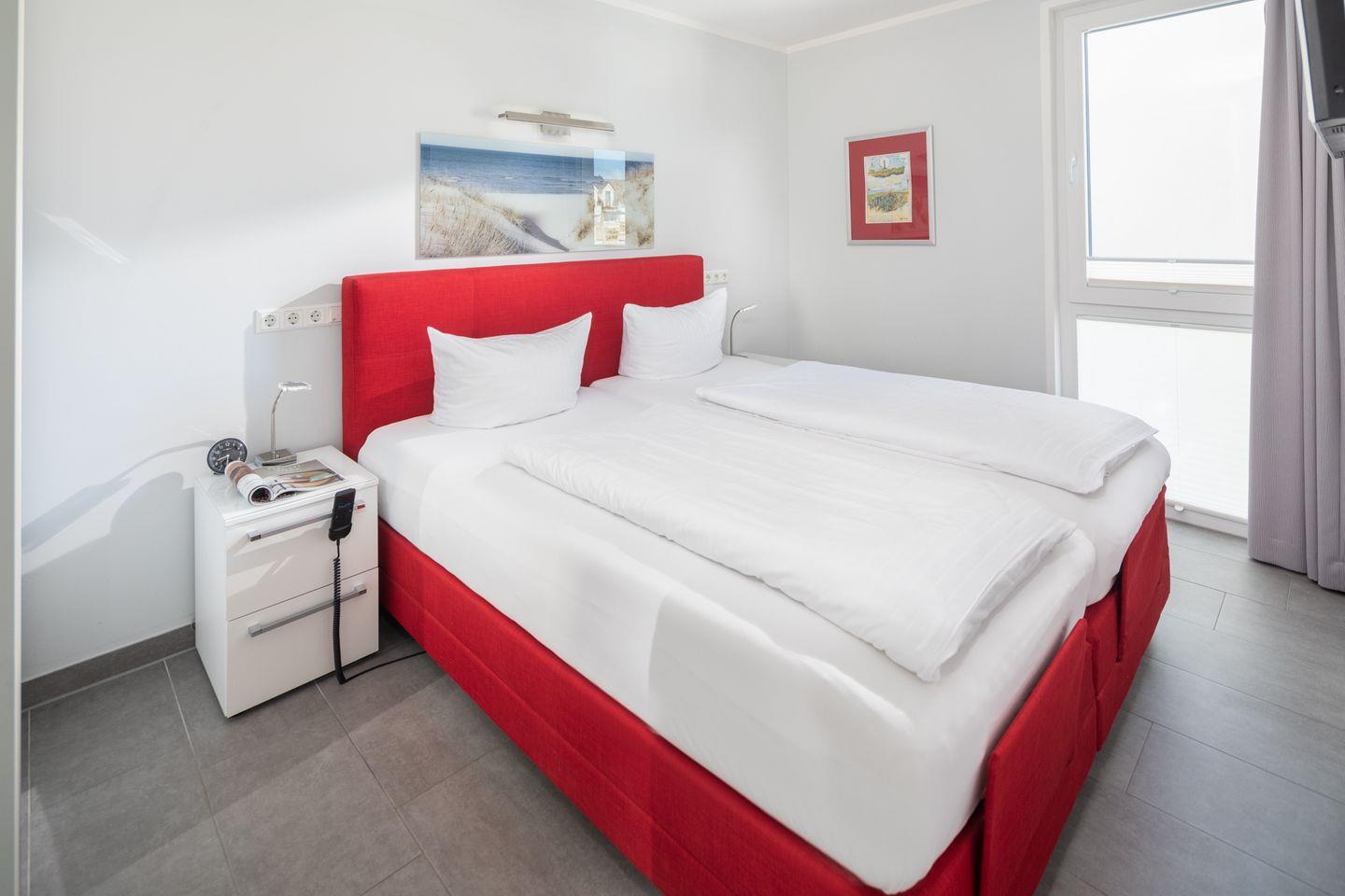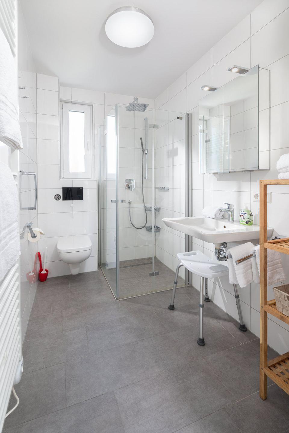 Beide Schlafzimmer verfügen über hochwertige Boxspringbetten der Größe 180x200cm sowie einen Fernseher. Im Badezimmer finden Sie eine ebenerdige Dusche vor. Außerdem ist das Waschbecken unterfahrbar