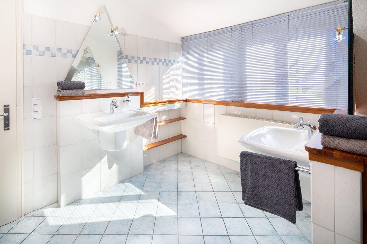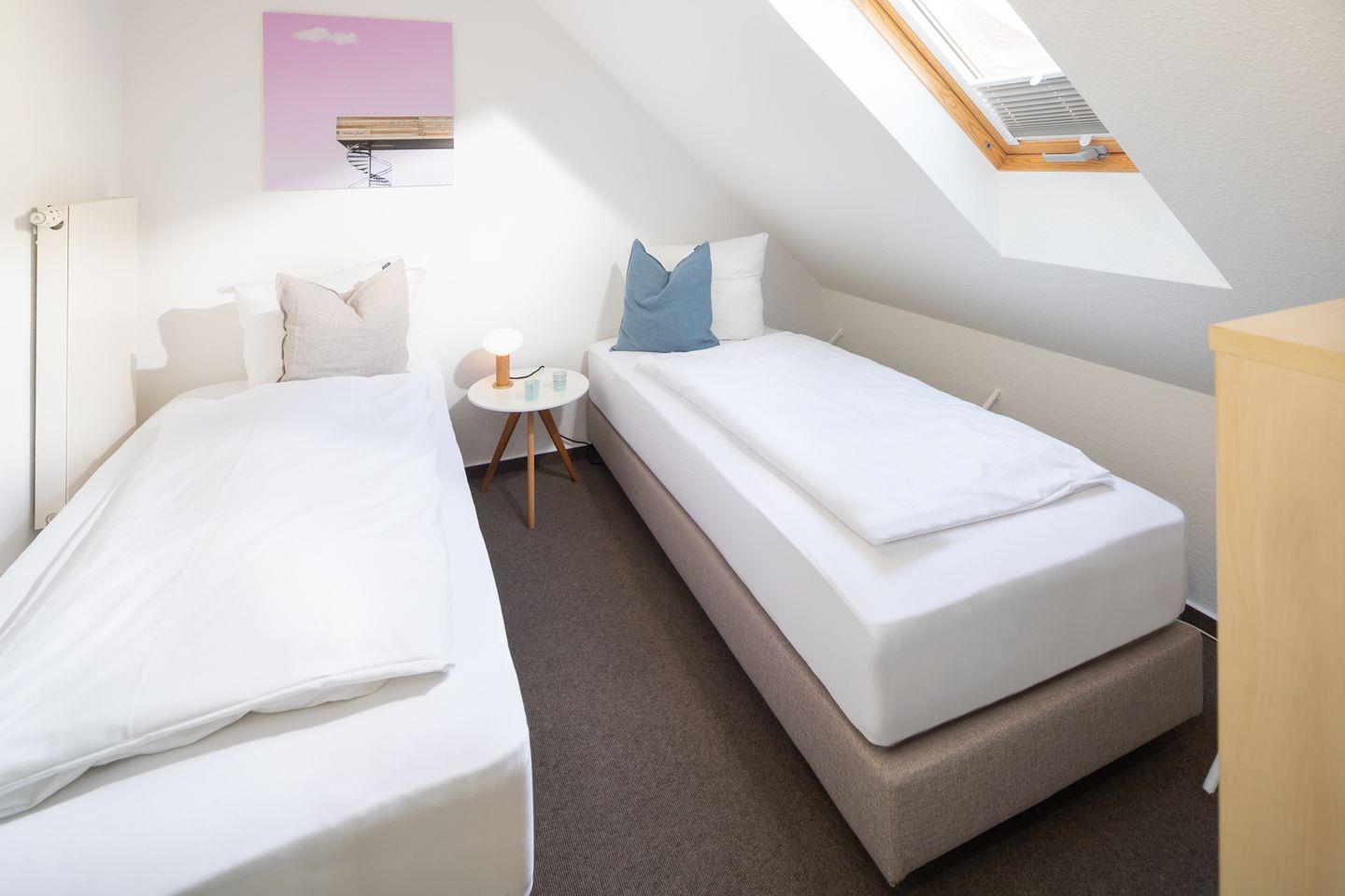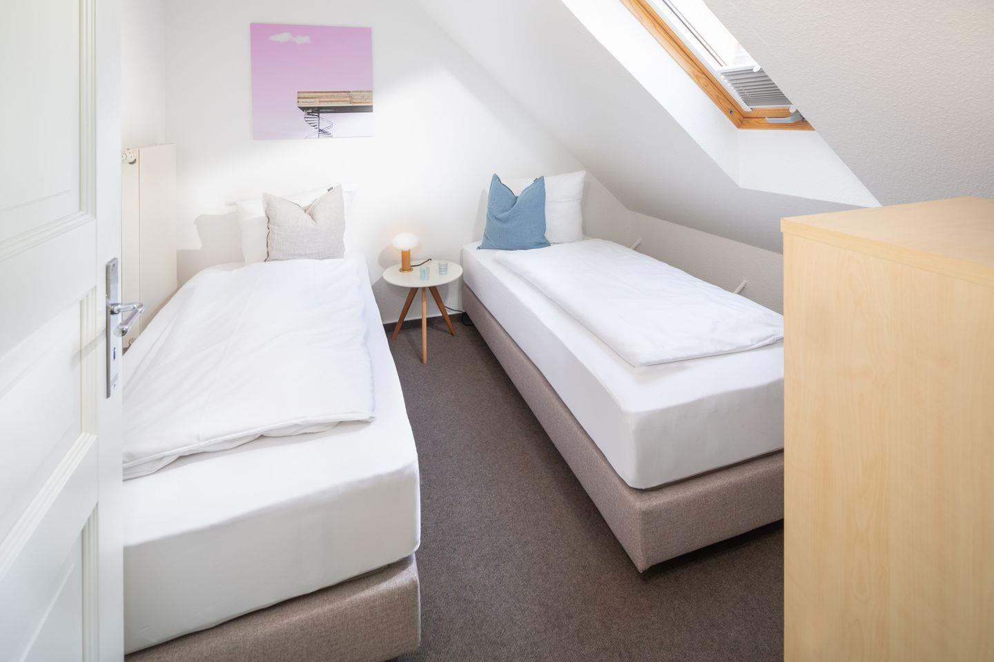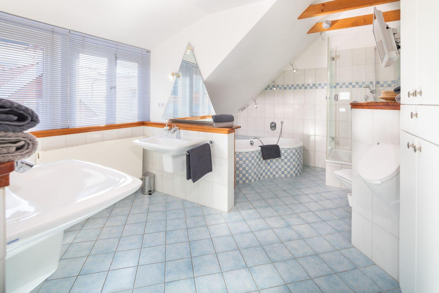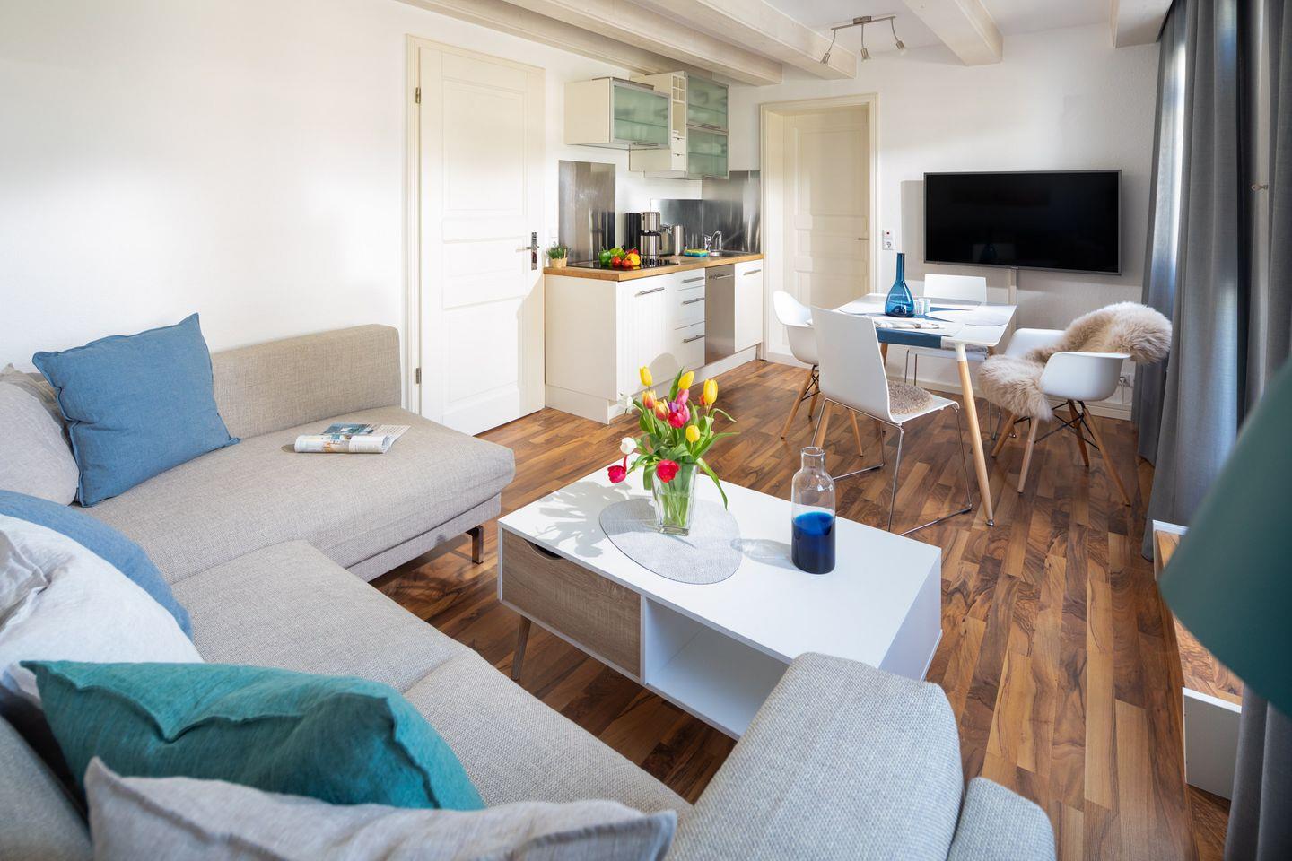 Sie liegt im ersten Stock und besteht aus einem Wohnzimmer mit Küche, einem Schlafzimmer mit Boxspringbett der Größe 180x200cm, einem Schlafzimmer mit zwei Einzelbetten (90x200cm) sowie einem großzügigen Badezimmer ausgestattet mit Dusche, Badewanne, zwei Waschbecken, WC und einem Tageslichtfenster.
