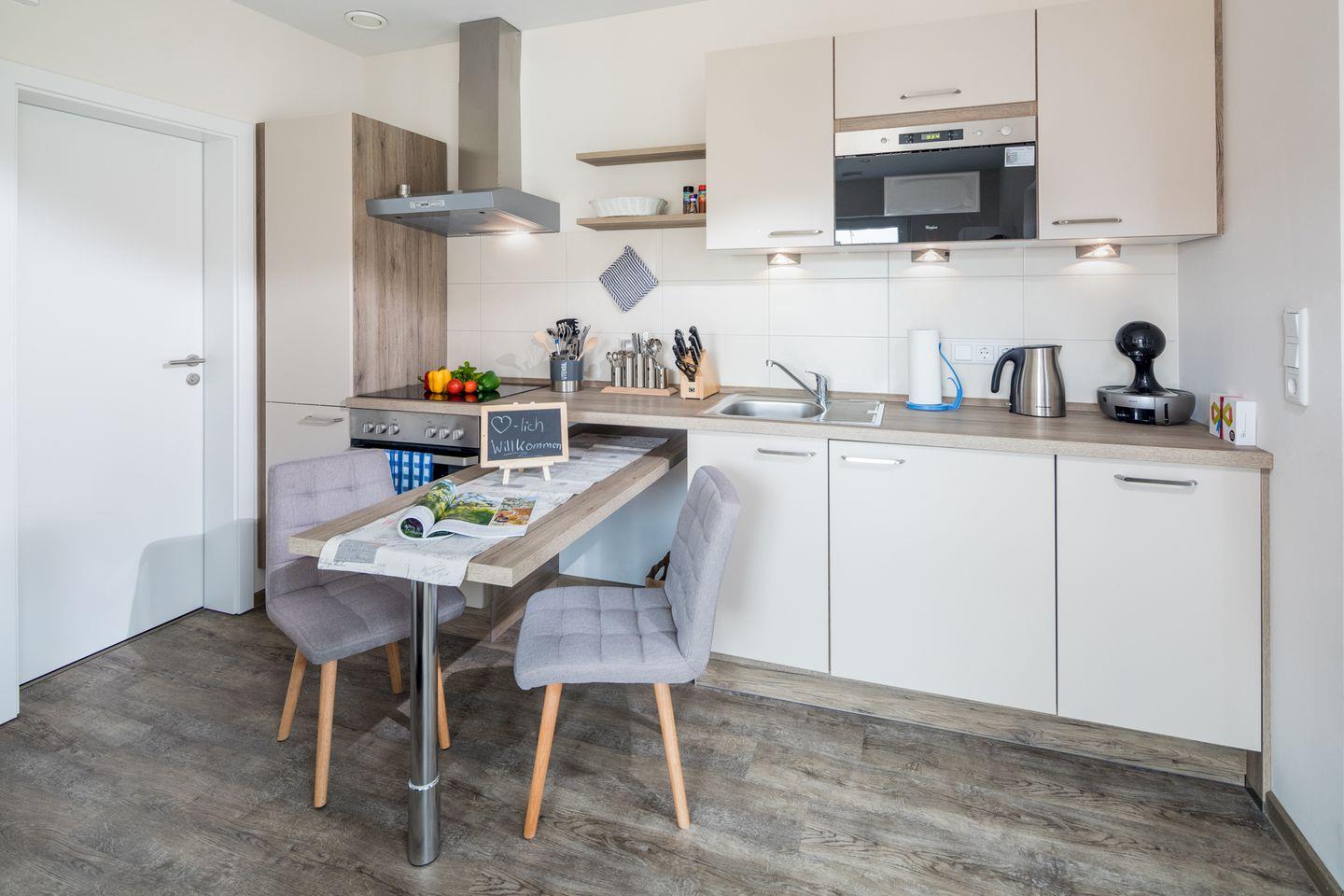 Die gut ausgestattete Küche lässt keine Wünsche offen. Dank des Backofens, der Spülmaschine, der Kaffeemaschine und des Kühlschranks mit Gefrierfach können Sie sich ganz einfach Ihre Lieblingsgerichte zaubern. Für die kleinen Gäste stehen ein Babybett und ein Hochstuhl zur Verfügung, weshalb sich die Wohnung hervorragend für Familien eignet.