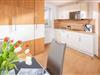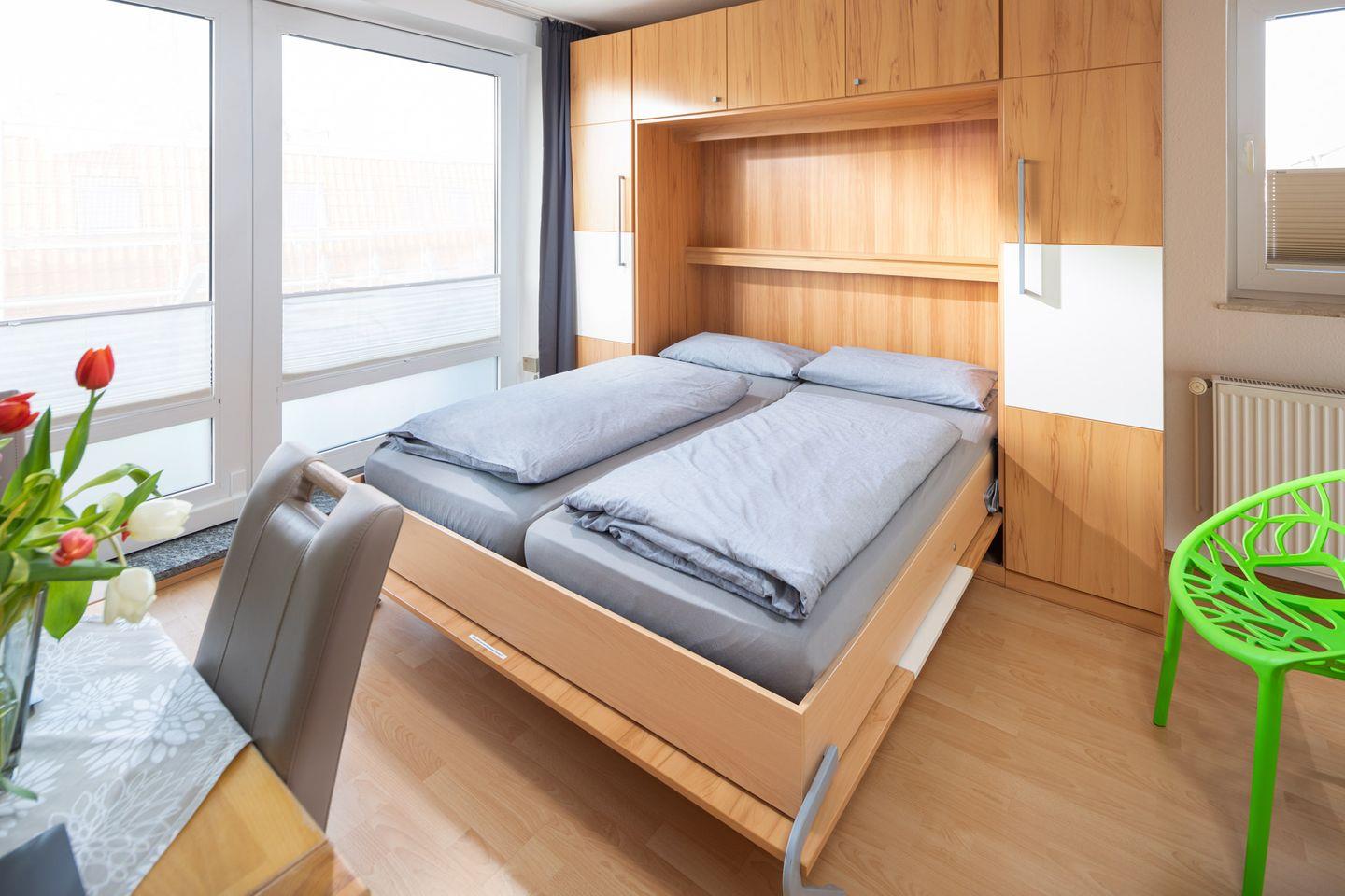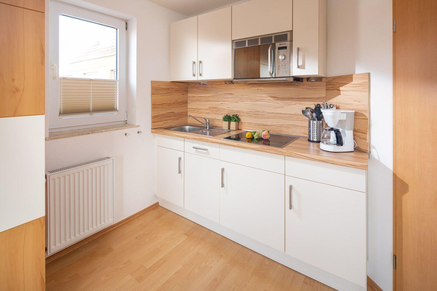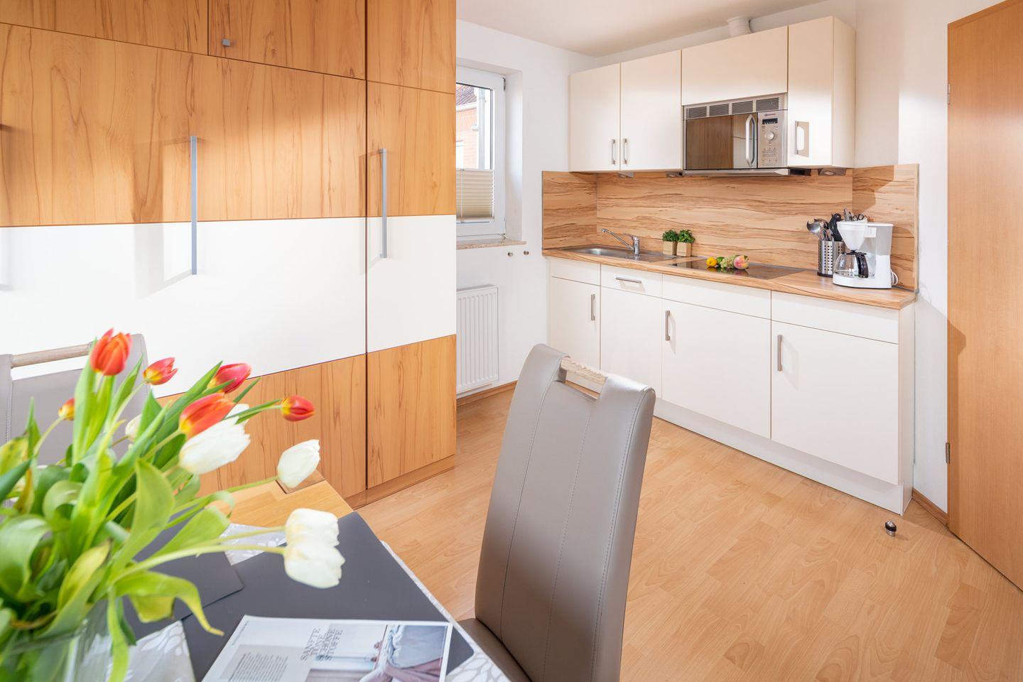 Die Wohnung verfügt über ein helles Schlafzimmer mit gemütlichem Laminatboden und einem komfortablen Einzelbett (90x200cm). Der offene Wohnbereich mit voll ausgestatteter Küche lädt dazu ein, gemeinsam zu kochen und zu speisen. Die Küchenzeile ist mit modernen Geräten wie einem Cerankochfeld, einer Spülmaschine, einer Kaffeemaschine, einer Mikrowelle und einem Toaster ausgestattet.