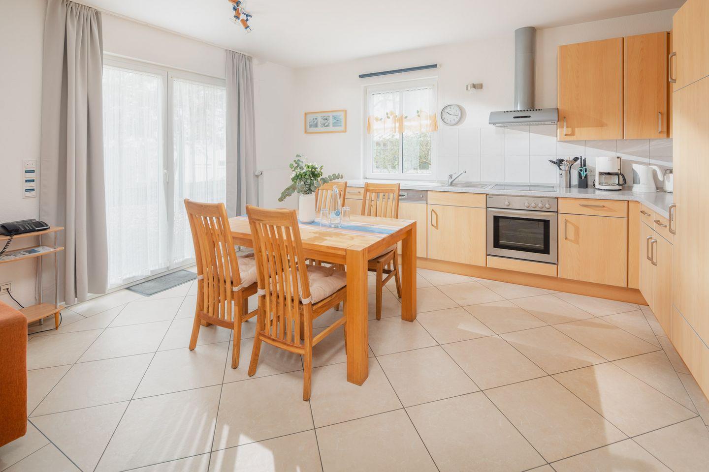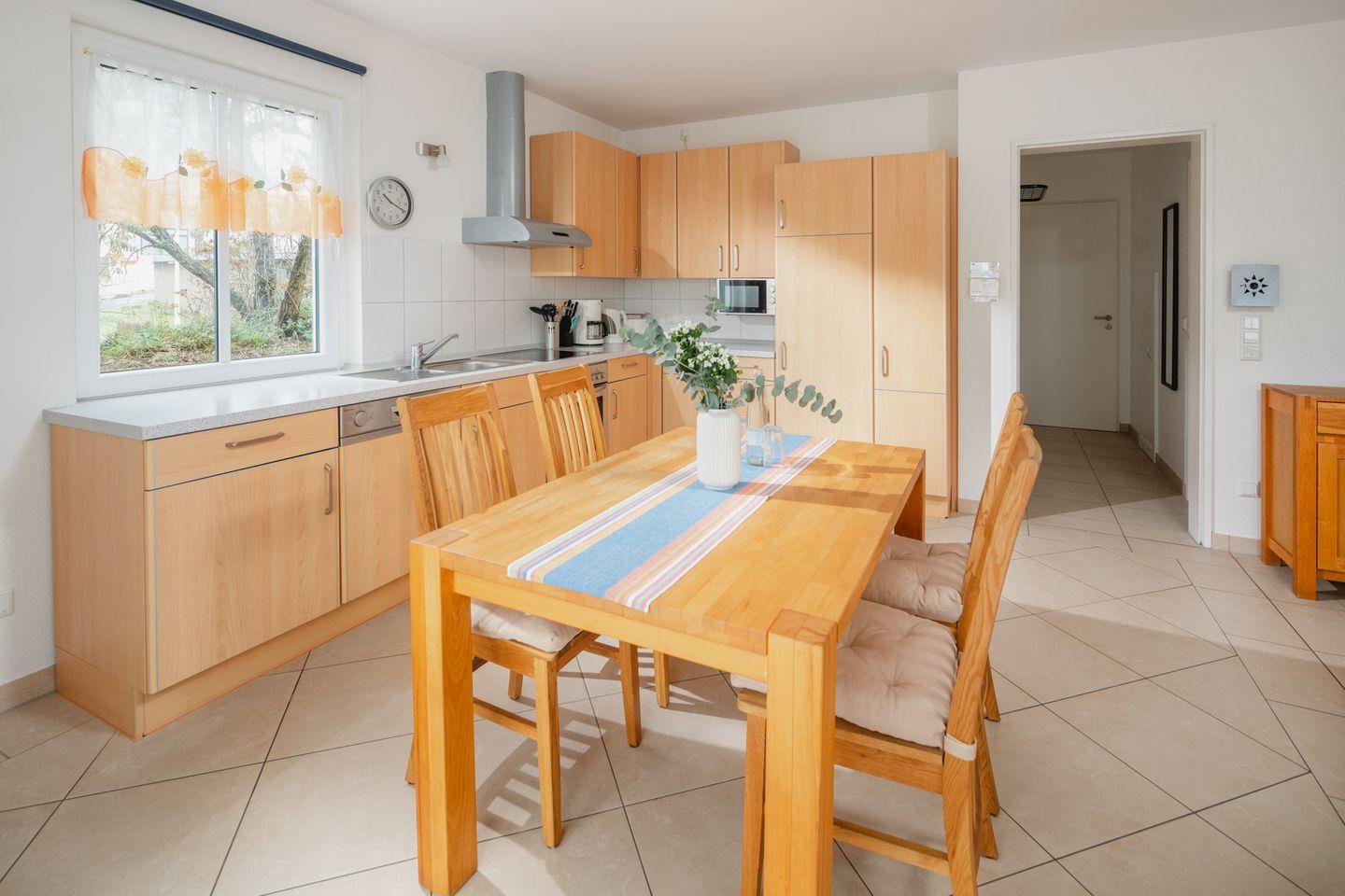 Ein großer Tisch mit 4 Stühlen kann als Bindeglied zwischen dem Wohnbereich und der Küchenzeile betrachtet werden.