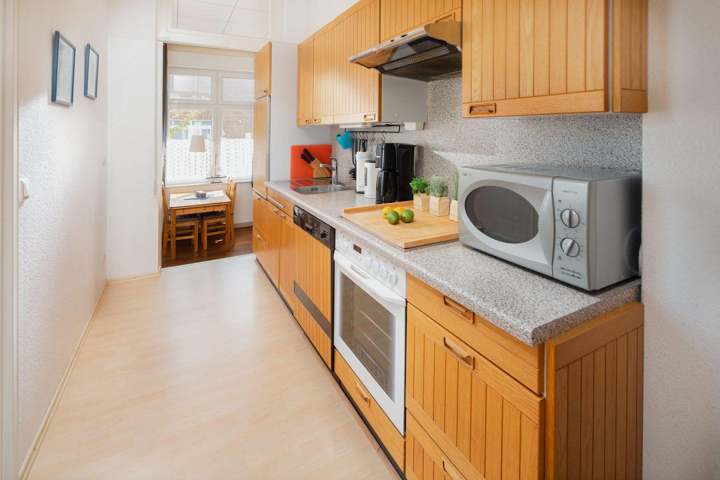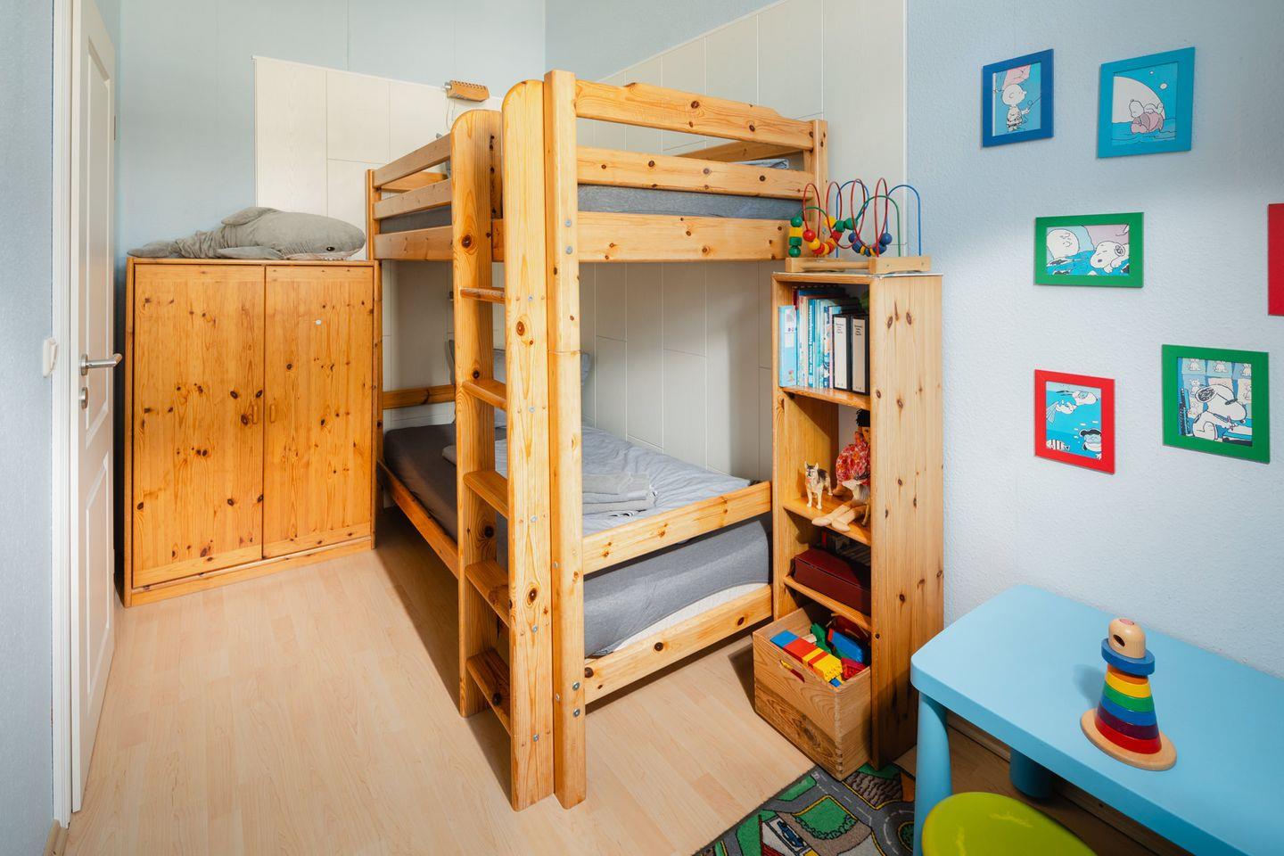 Die Wohnung verfügt über zwei Schlafzimmer einmal mit Doppelbett (180x200cm) und im Kinderzimmer ein Etagenbett (90x200cm), die für eine erholsame Nachtruhe sorgen. Im offenen Wohnbereich erwartet Sie eine Küche, die mit sämtlichen Annehmlichkeiten ausgestattet ist – vom Backofen über die Spülmaschine bis hin zur Kaffeemaschine. Hier können Sie zusammen mit Ihren Liebsten leckere Gerichte zubereiten und sich an den gemeinsamen Mahlzeiten im einladenden Essbereich erfreuen.