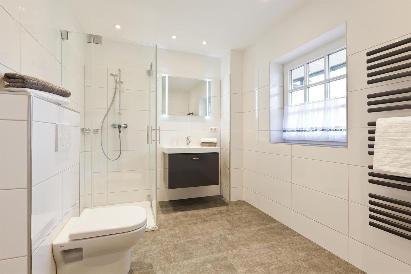 Das große und helle neue Duschbad mit Fenster rundet das Angebot ab und sorgt für einen frischen Start in den Tag. Die geschmackvolle Gestaltung der Räume schafft eine gemütliche Atmosphäre.