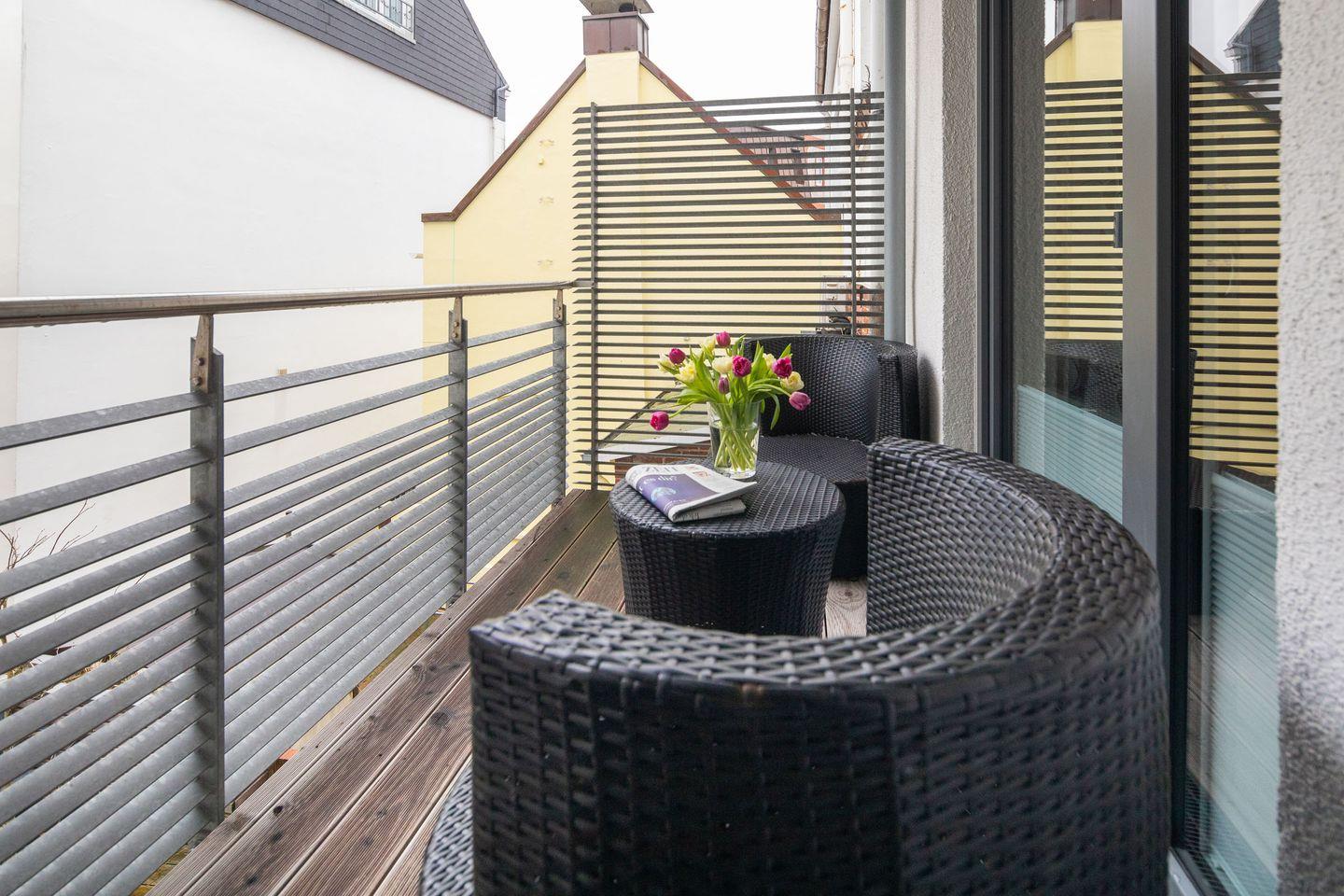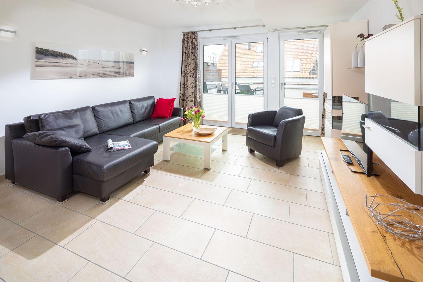 Die Dachterrasse der Ferienwohnung bietet einen atemberaubenden Blick auf die Nordsee und das lebhafte Treiben am Denkmal. Morgensonne auf dem Balkon vor dem Schlafzimmer rundet das perfekte Urlaubserlebnis ab. Die barrierefreie Lifterschließung macht die Wohnung auch für Gehbehinderte zugänglich.
