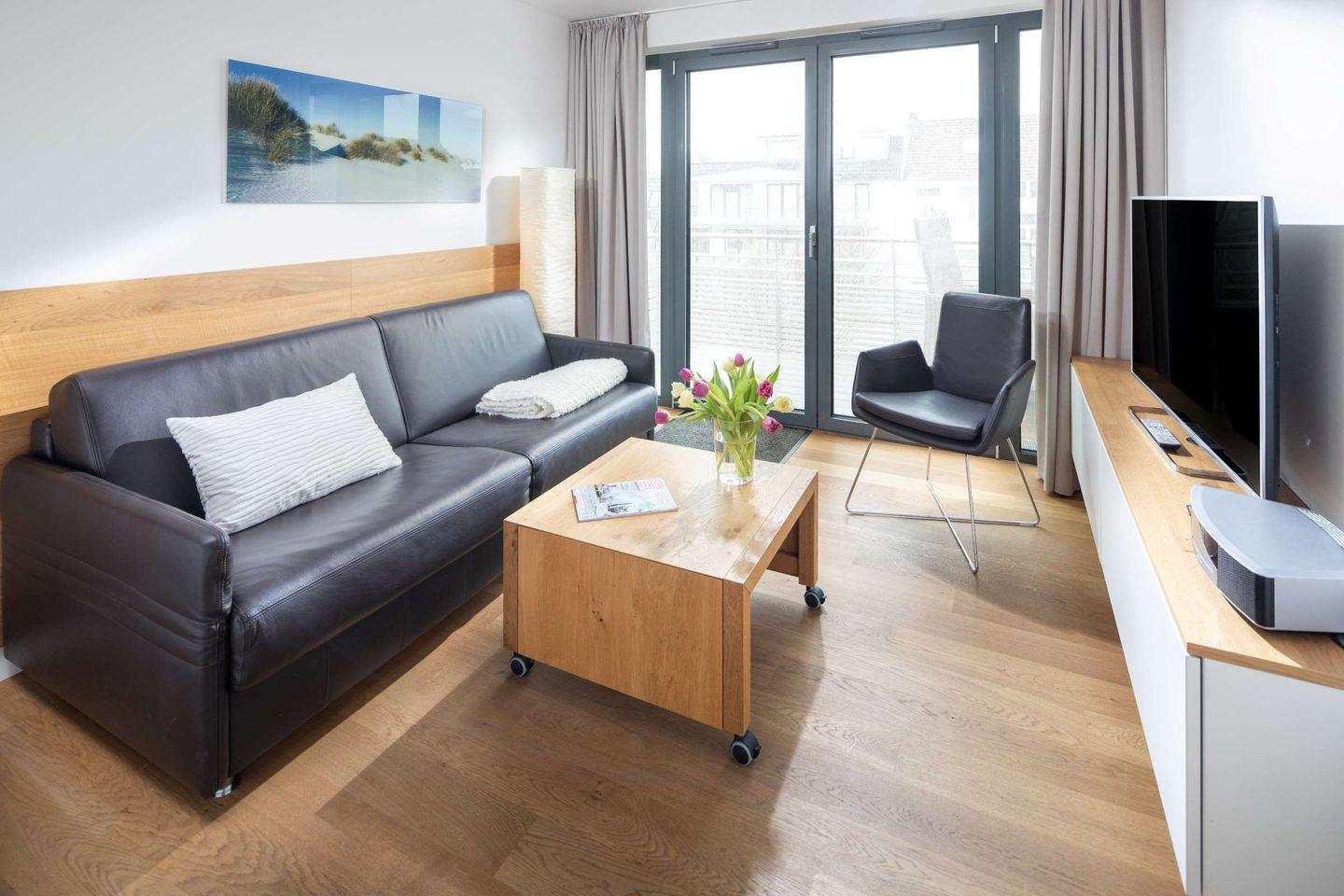 Mit etwa 40qm Wohnerlebnis und einem direkten Liftzugang erwartet Sie eine komfortable Gästesuite. Die Suite verfügt über eine eigene Küche, einen Wohnbereich, einen Balkon, ein Bad und einen separaten Doppelbett-Schlafbereich, der bei Bedarf in Einzelbetten geteilt werden kann. Zusätzlich steht im Wohnbereich ein Schlafsofa für zwei weitere Personen zur Verfügung. Die ideale Belegung liegt bei 2 Erwachsenen, jedoch bietet die Ferienwohnung Platz für maximal 4 Erwachsene.