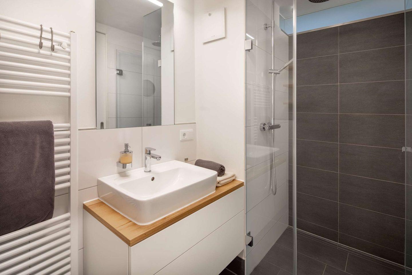 Genießen Sie den Außenbalkon über den Dächern des Innenstadtquartiers, der über einen schwellenfreien und barriere-gerechten Zugang erreichbar ist. Das Badezimmer beeindruckt mit einem bodenbündigen Duschbereich und einer Rain-Dusche. Ein separater Abstellraum steht Ihnen zur Verfügung, um Ihr Urlaubs-Equipment, Sportgeräte oder Strandwagen bequem unterzubringen.