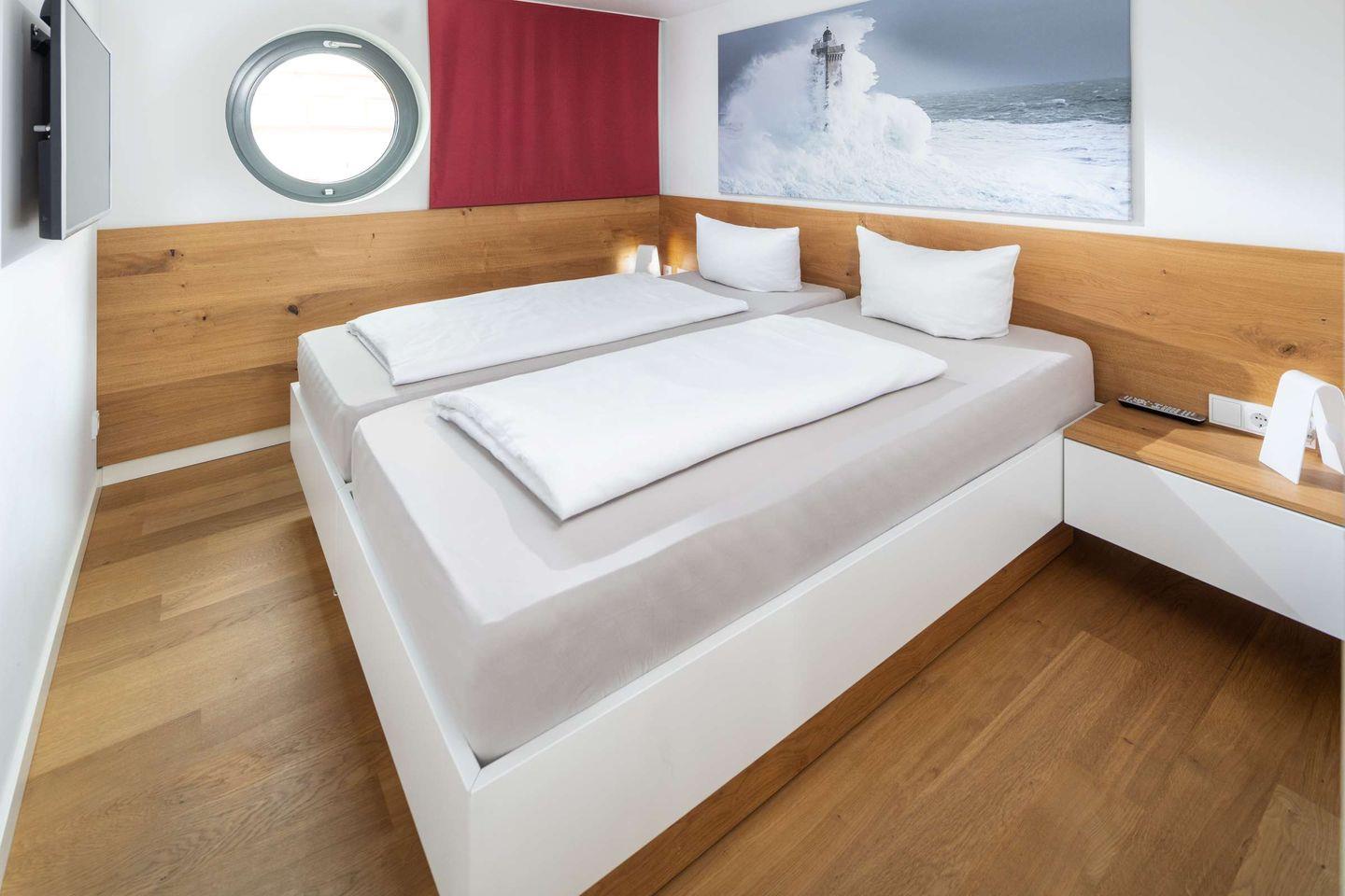 teilbar in Einzelbetten. Schlafsofa im Wohnbereich für zwei weitere Personen.