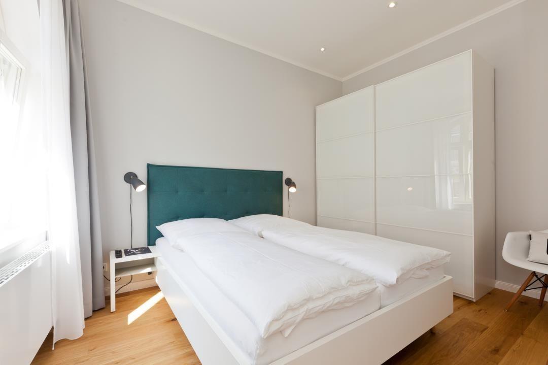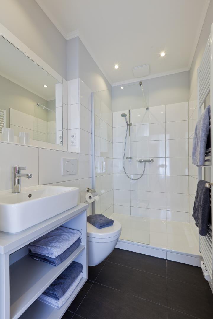 Die Ferienwohnung verfügt über ein separates Schlafzimmer, das Rückzug und Entspannung nach einem erlebnisreichen Tag auf der Insel bietet. Hier können Sie in einem behaglichen Ambiente zur Ruhe kommen. Das moderne Bad ist stilvoll gestaltet und mit zeitgemäßer Ausstattung versehen.