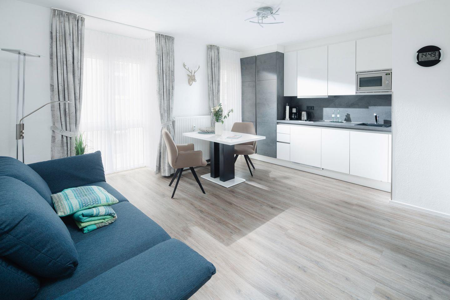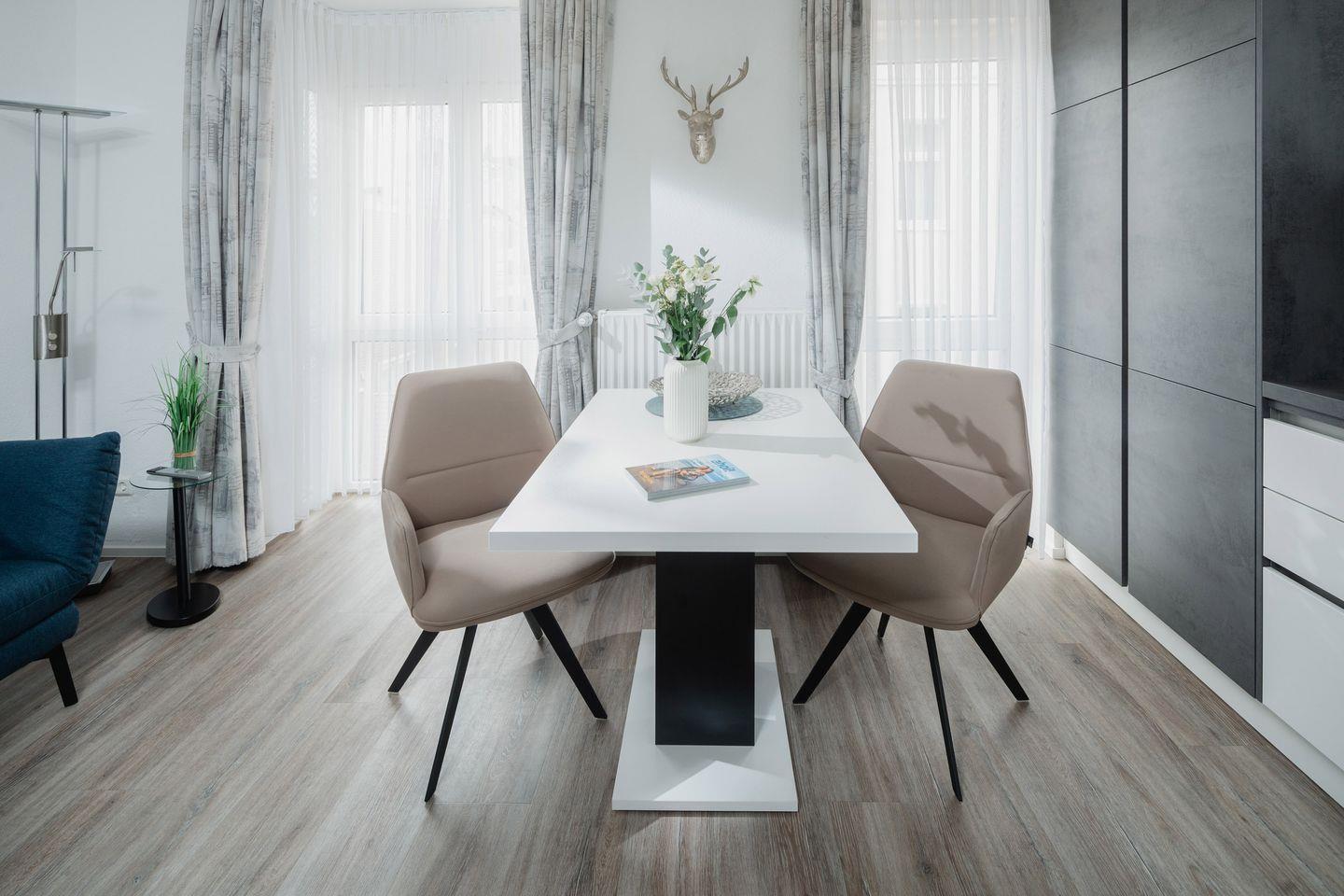 Das Luisenstudio wurde von Grund auf in 2021 renoviert. Es erwartet Sie eine ca. 33 qm große Wohnung, für bis zu 2 Personen. Die Ferienwohnung bietet Ihnen eine Komposition aus natürlichen, farblich abgestimmten Materialien, die Ihnen Gemütlichkeit und Wohnkomfort garantieren. Sehr bequeme, drehbare Sitzstühle, eine moderne Küchenzeile mit umfangreicher Ausstattung und zwei Sessel komplettieren den Raum. Zum separaten Schlafbereich gehören ein Boxspringbett und Wandbeleuchtungen, in die jeweils ein USB-Anschluß für Ihr Smartphone integriert ist. Das Bad glänzt mit italienischen Designerstücken und außergewöhnlicher Farbgestaltung.