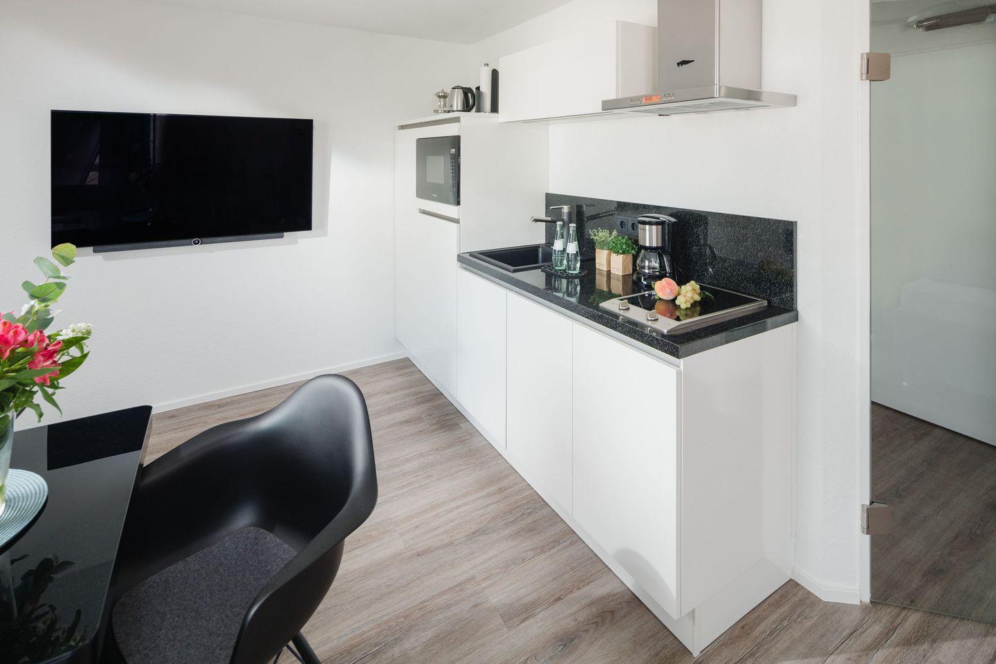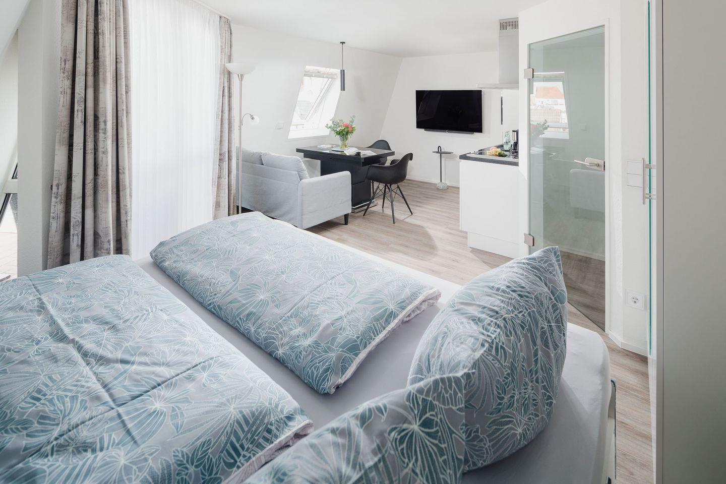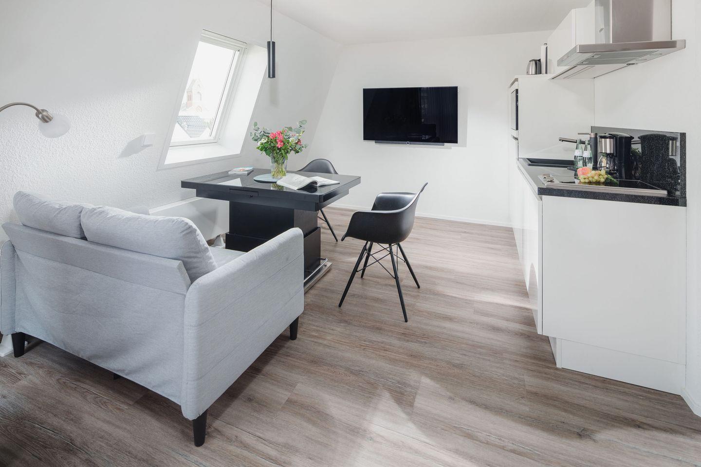Die Luisensuite wurde von Grund auf in 2021 renoviert. Es erwartet Sie eine ca. 29 qm große Wohnung für bis zu 2 Personen nebst einer ca. 3 qm großen Loggia. Die Ferienwohnung bietet Ihnen eine Komposition aus natürlichen, farblich abgestimmten Materialien, die Ihnen Gemütlichkeit und Wohnkomfort garantieren. Ein höhenverstellbarer Tisch im Wohnbereich lädt zum Frühstücken mit herrlichem Blick auf die Insel oder zum Relaxen ein. Die indirekte Beleuchtung seitlich des Boxspringbetts schafft eine besondere Atmosphäre. Die Küchenzeile mit Miele-Geräten ist mit italienischem Granit bestückt. Das Bad glänzt ebenfalls mit italienischen Designerstücken und außergewöhnlicher Farbgestaltung. Für Unterhaltung sorgen ein LOEWE-Fernseher mit digitalem Radioempfang, USB-Anschluss und Internetfunktion. Ein kostenloser WLAN-Zugang steht Ihnen in der gesamten Wohnung zur Verfügung. Ein Fahrradraum, Waschmaschine und Trockner befinden sich im UG, ein Aufzug ist vorhanden.