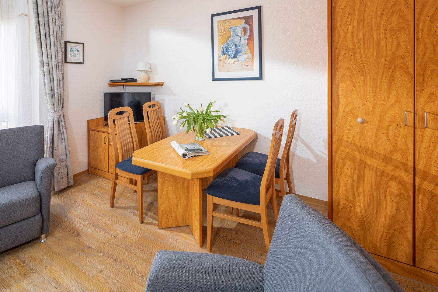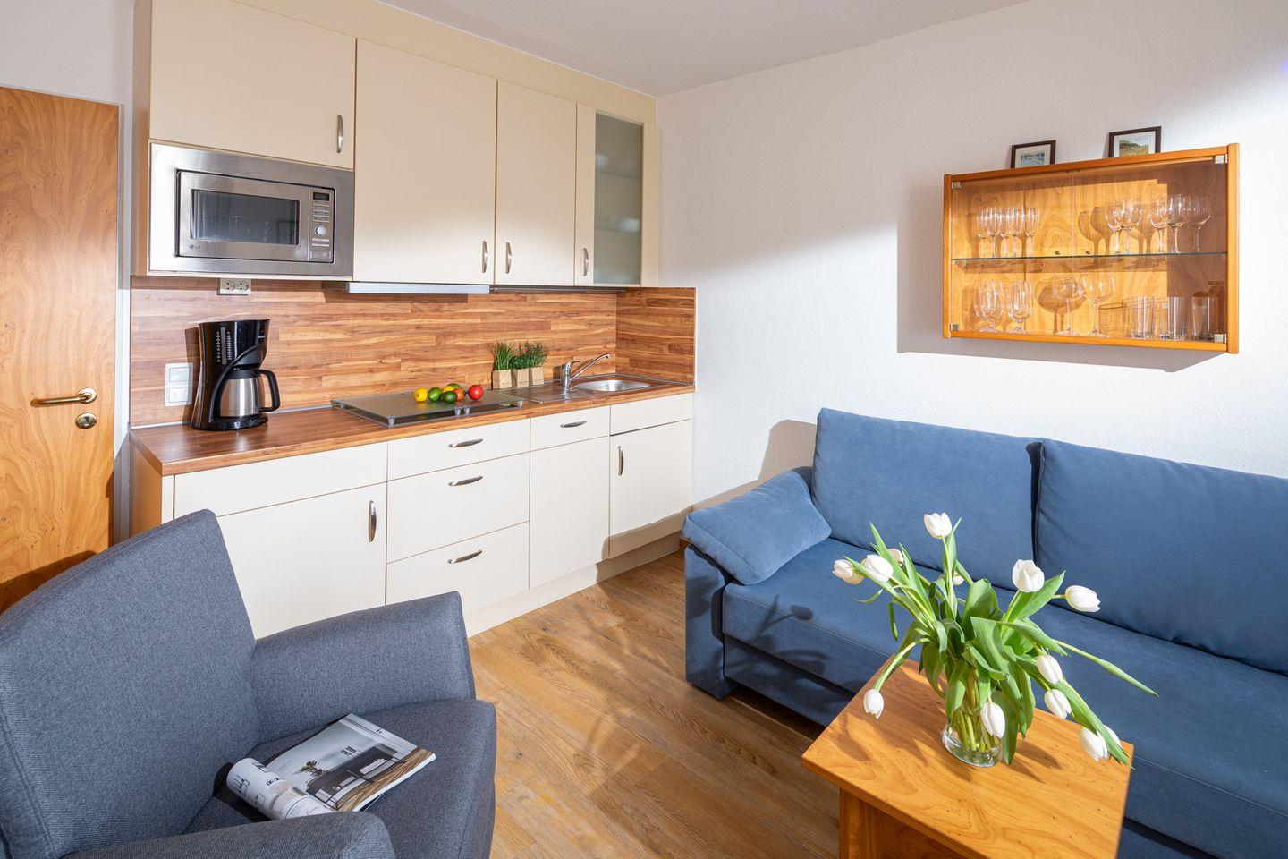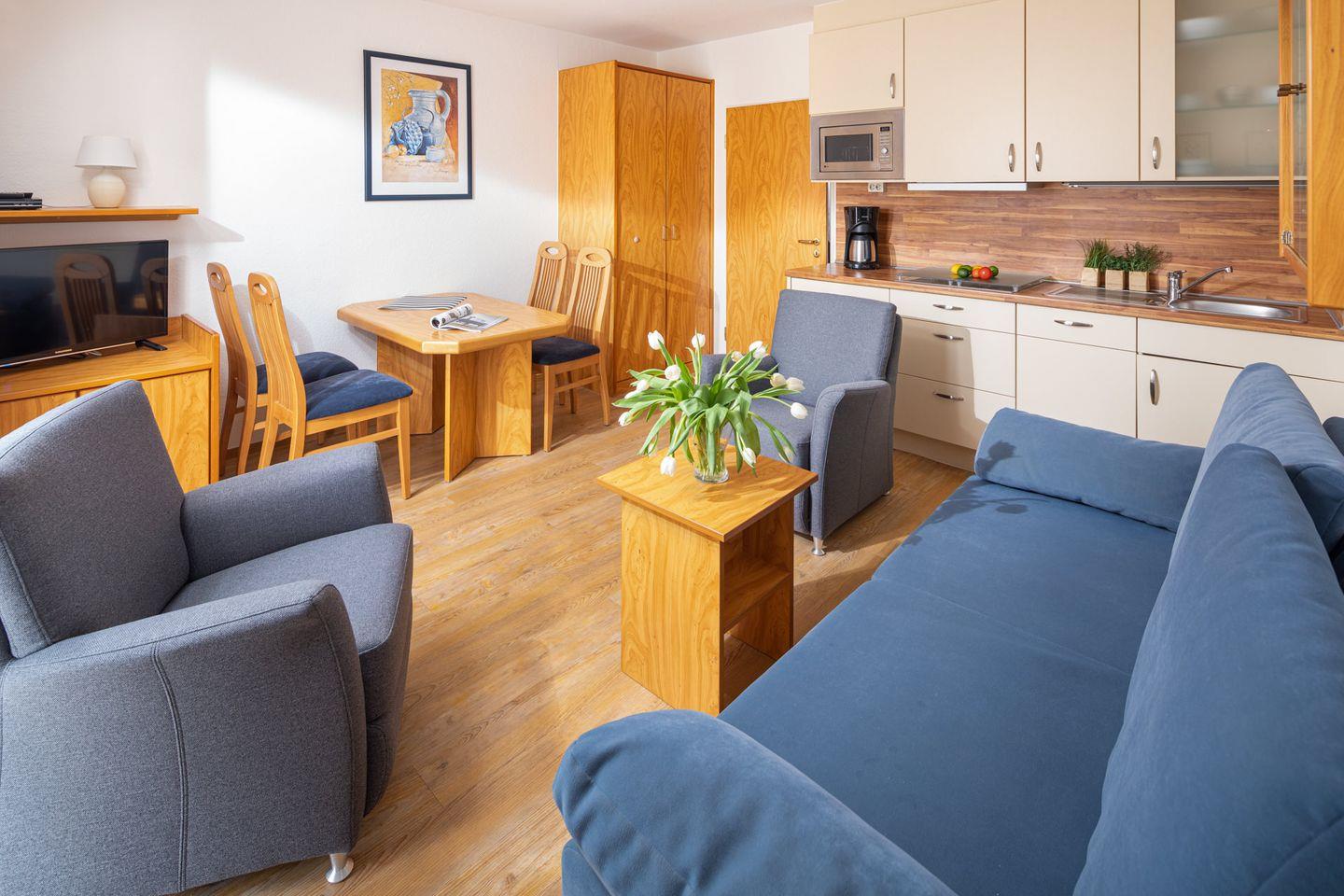 Das Appartement verfügt über ein separates Schlafzimmer mit zwei Einzelbetten, was optimale Privatsphäre und Erholung ermöglicht. Im Wohnzimmer erwartet Sie eine Sitzgarnitur mit einem bequemen Ausziehsofa (Liegebreite 1,60 m), eine Essecke und eine gut ausgestattete Einbauküche. Der Flur führt Sie zu einem Badezimmer mit Dusche und WC, komplett ausgestattet für Ihren Komfort.