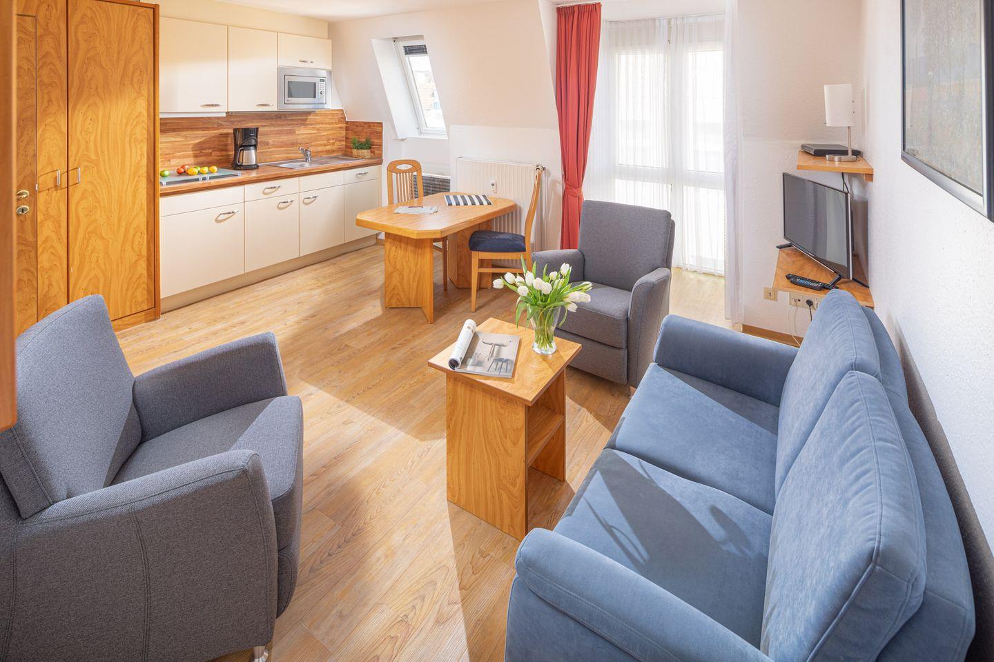 Das Appartmenthaus Kogge liegt in ruhiger, zentraler Lage in der Luisenstraße 17, Eingang Lüttji Damenpfad. Von hier aus sind es gerade mal 200m zum Weststrand, Milchbar, Marienhöhe, ebenso wie zur Poststraße und Strandstraße mit dem lebendigen Flair der Fußgängerzone. Die Wohnung 14 befindet sich im 2. Obergeschoss und ist für 2 Personen ausgestattet. Sie bietet Flat-TV, CD/DVD-Player und auch einen Internetzugang über W-LAN. Ein Schlafzimmer mit Doppebett, im Wohnzimmer eine Sitzgarnitur, eine Essecke, eine gut ausgestattete Einbauküche, sowie Badezimmer mit Dusche und WC. Alle Etagen sind mit dem Aufzug erreichbar. Im UG finden Sie ein Fahrradraum sowie Waschmaschine und Trockner.