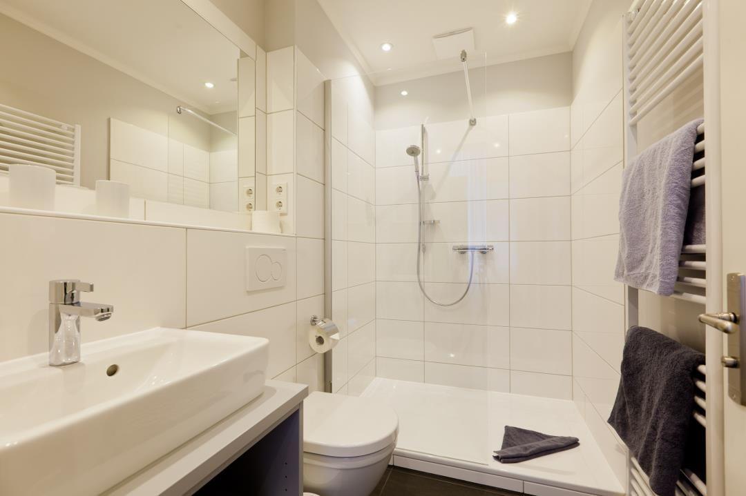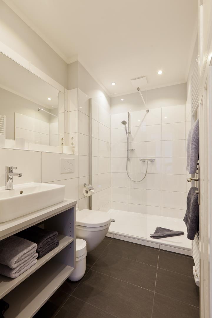 Das moderne Duschbad beeindruckt mit einer flachen Dusche und zeitgemäßer Ausstattung, um Ihren Aufenthalt so angenehm wie möglich zu gestalten. Holzfenster, die den historischen Charme spiegeln und den Denkmalschutz berücksichtigen, fügen sich gekonnt in das Design der Wohnung ein.