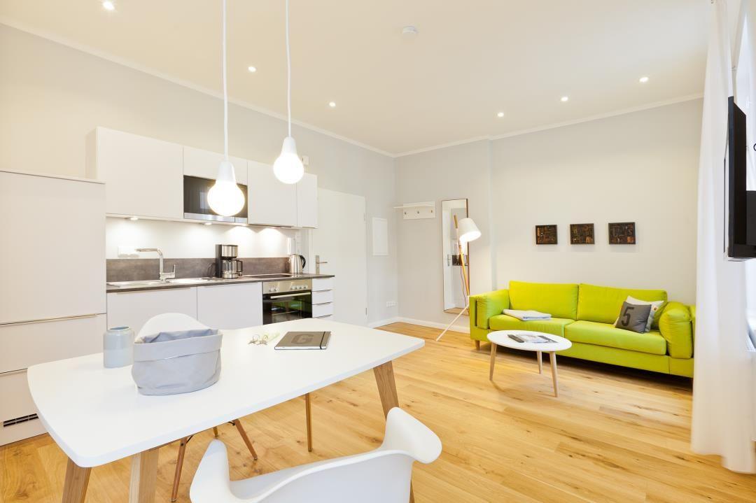 Die offene Küche begeistert nicht nur durch ihre klaren Linien, sondern auch durch ihre moderne Ausstattung, einschließlich einer Spülmaschine. Hier können Sie Ihre kulinarischen Vorlieben nach Herzenslust ausleben. Die klaren Linien setzen sich im gesamten Design der Wohnung fort und schaffen eine verbindliche Atmosphäre, die Tradition und Moderne geschickt miteinander vereint.
