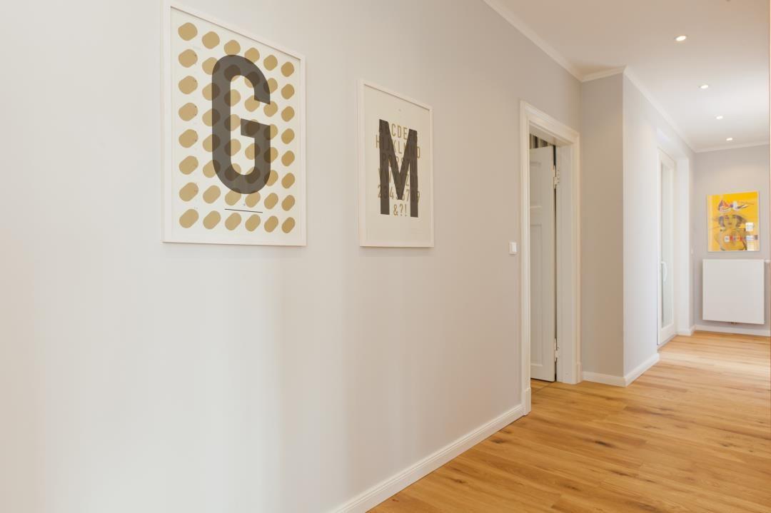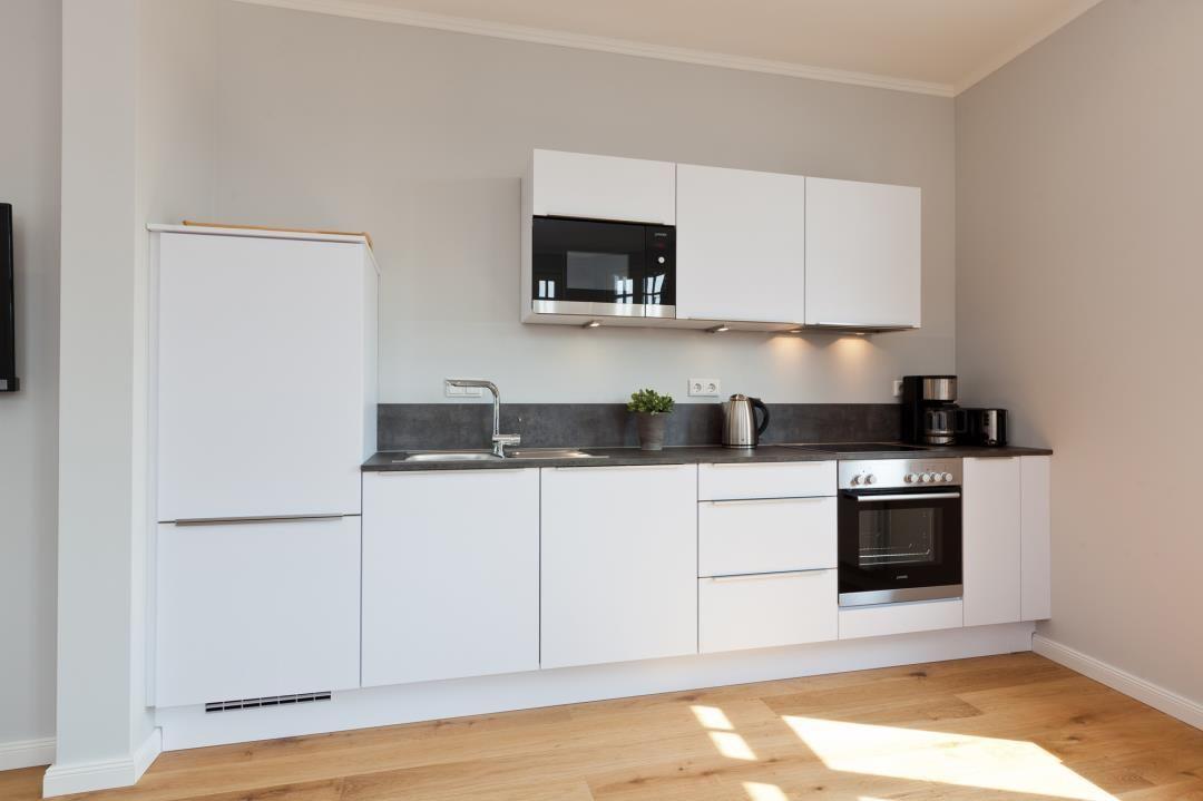 Der großzügige Wohnbereich mit integrierter Küche ist nicht nur geschmackvoll eingerichtet, sondern auch besonders geräumig und voll ausgestattet. Die moderne Küche lädt dazu ein, gemeinsame Mahlzeiten zuzubereiten und gemütliche Abende zu verbringen. Das Echtholz Eichenparkett unterstreicht den hochwertigen Charakter der Wohnung.