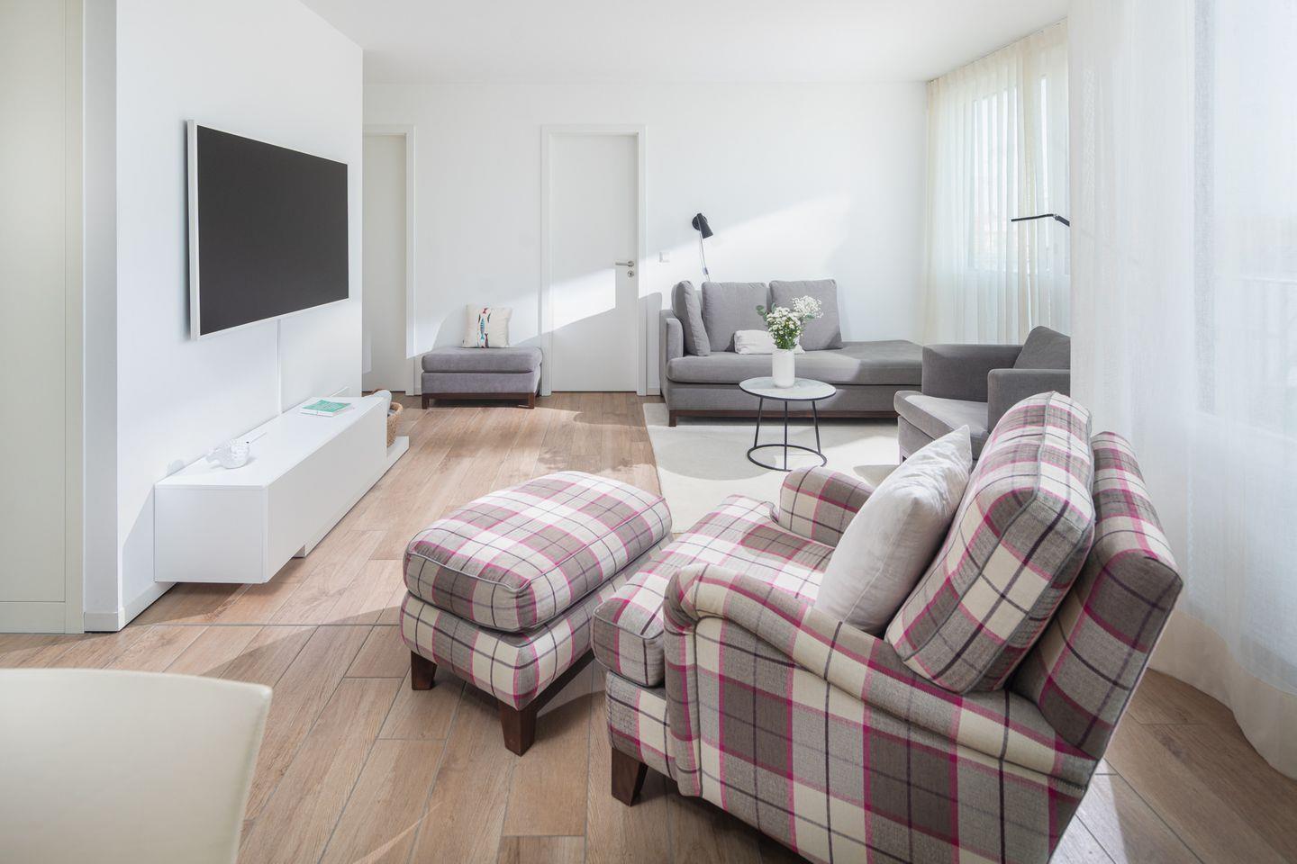 Das Wohnzimmer überzeugt mit einer hochwertigen, voll ausgestatteten Küche, einem gemütlichen Kamin sowie einem großen Smart-TV – ideal für entspannte Abende. Auch in beiden Schlafzimmern stehen Smart-TVs zur Verfügung.