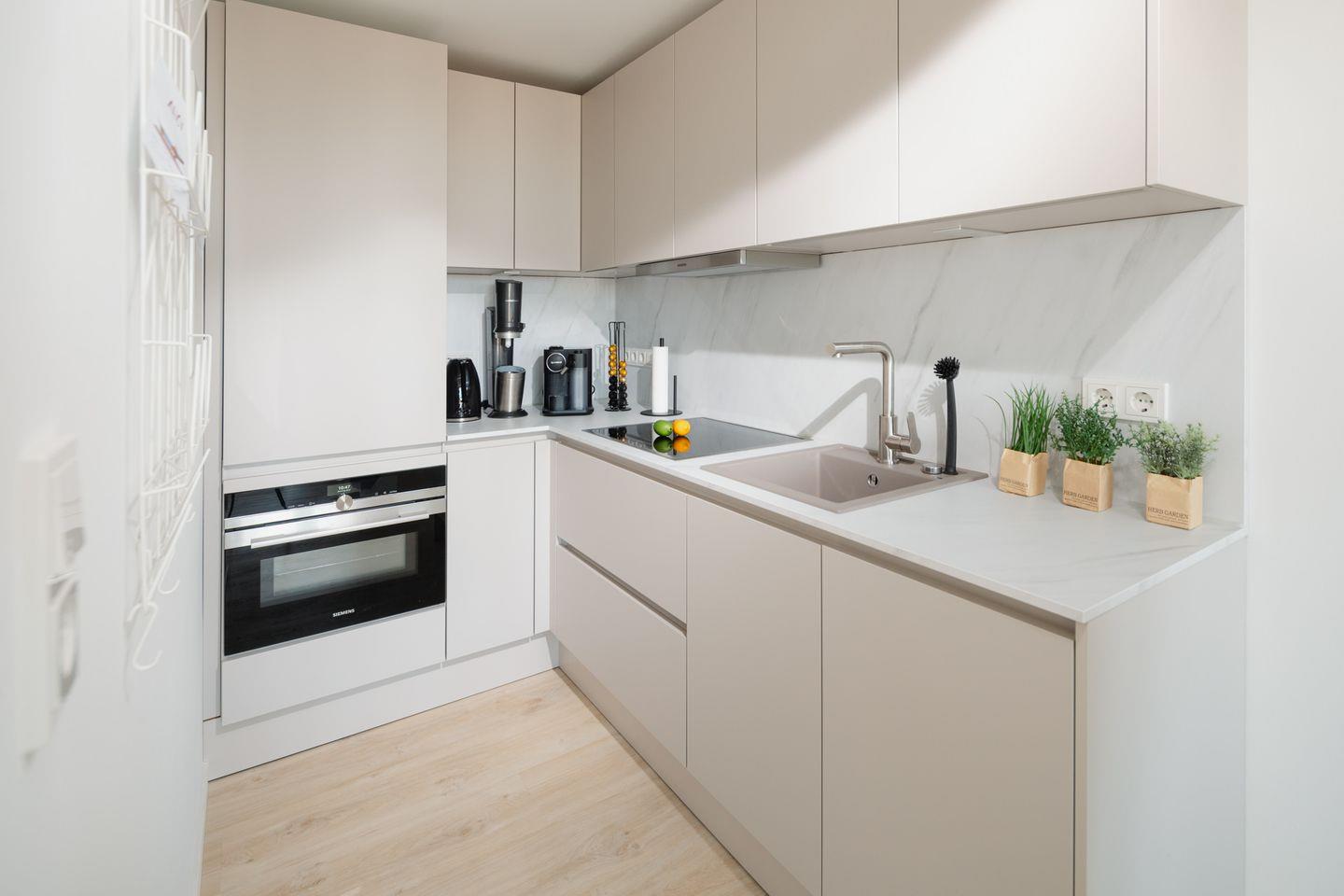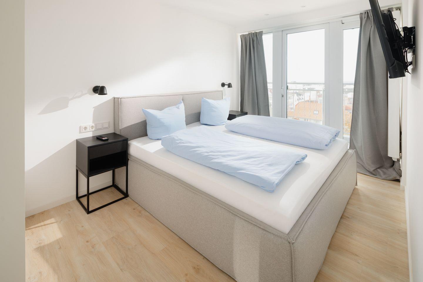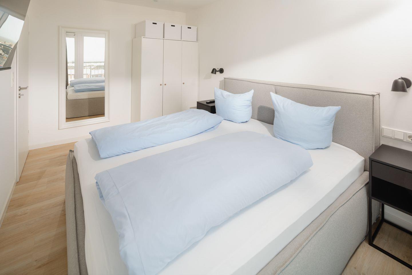 Die Wohnung Nr. 70 wurde 2022 grundsaniert und mit hochwertigen Möbeln ausgestattet. Sie bietet ein separates Schlafzimmer mit einem Doppelbett und eine Schlafcouch im Wohnzimmer, die eine zusätzliche Schlafgelegenheit für eine getrennt schlafende Person bietet. Die kleine Küchenzeile ist voll ausgestattet und das Bad verfügt über eine Dusche und ein WC. Zudem verfügt die Wohnung über einen Balkon mit seitlichem Blick auf das Meer.