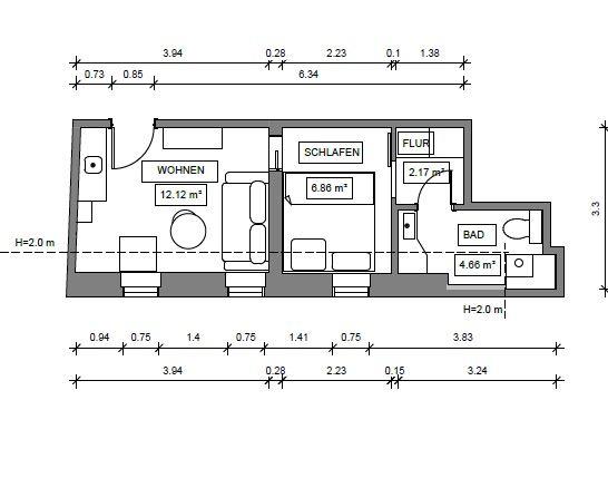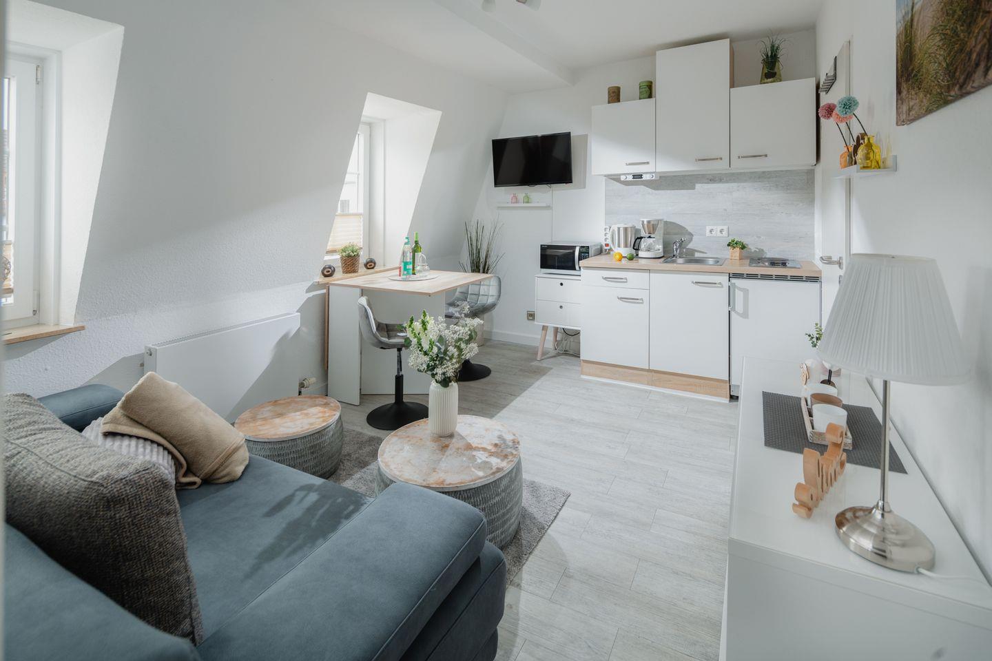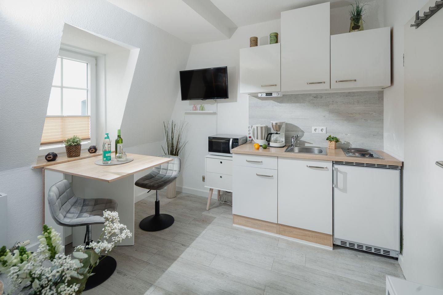 Die offene Küche, die nahtlos in den Wohnbereich übergeht, ist mit allen notwendigen Geräten ausgestattet, darunter ein Kühlschrank, eine Mikrowelle, ein Herd mit 2 Platten sowie eine Kaffeemaschine, Wasserkocher und Toaster. Hier können Sie sich Ihre Lieblingsgerichte zubereiten und mit Ihren Liebsten am Esstisch genießen. Für Ihr leibliches Wohl sorgt die etwa 300 Meter entfernte Restaurantvielfalt, wo Sie regionale Köstlichkeiten und frisch zubereitete Speisen entdecken können.