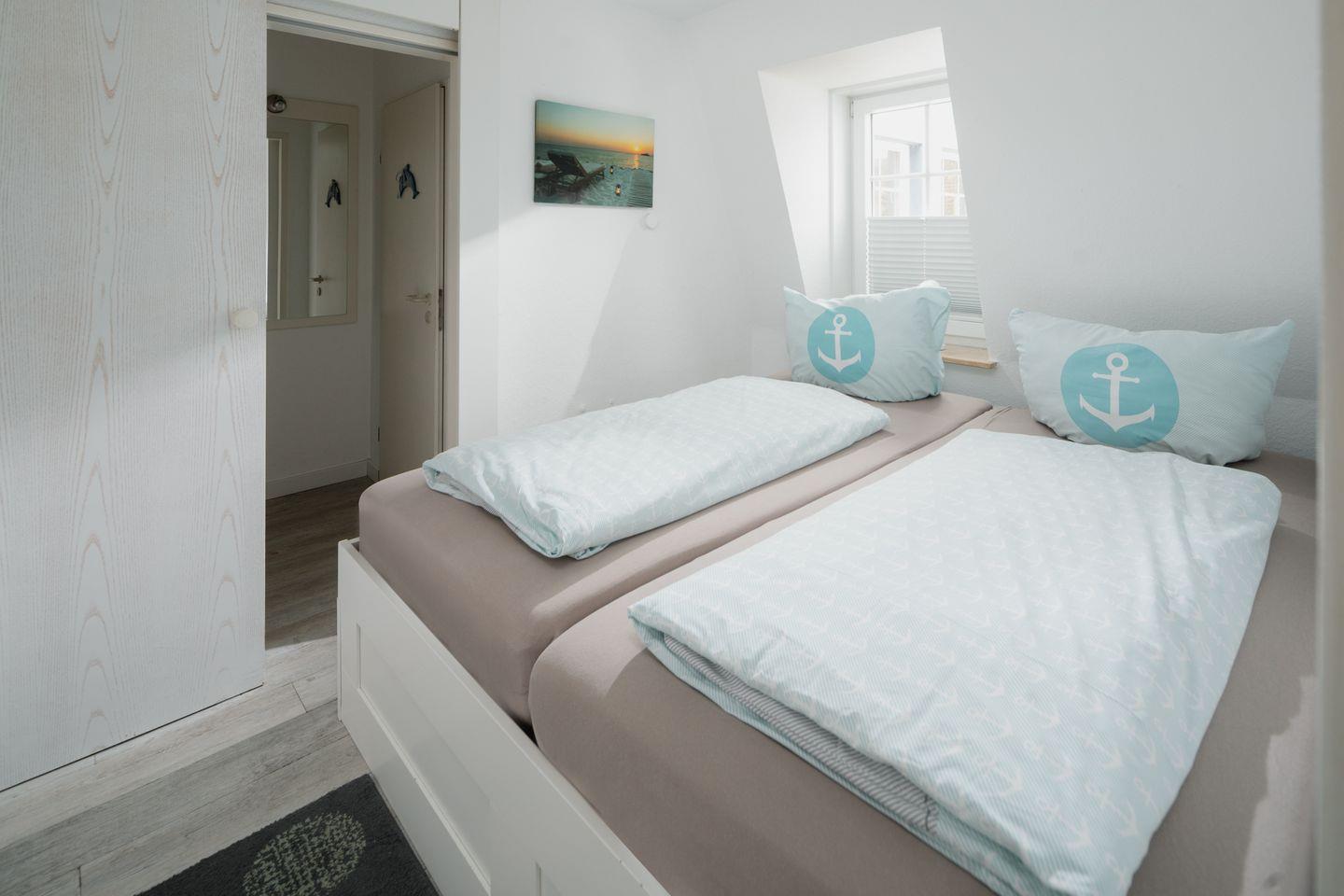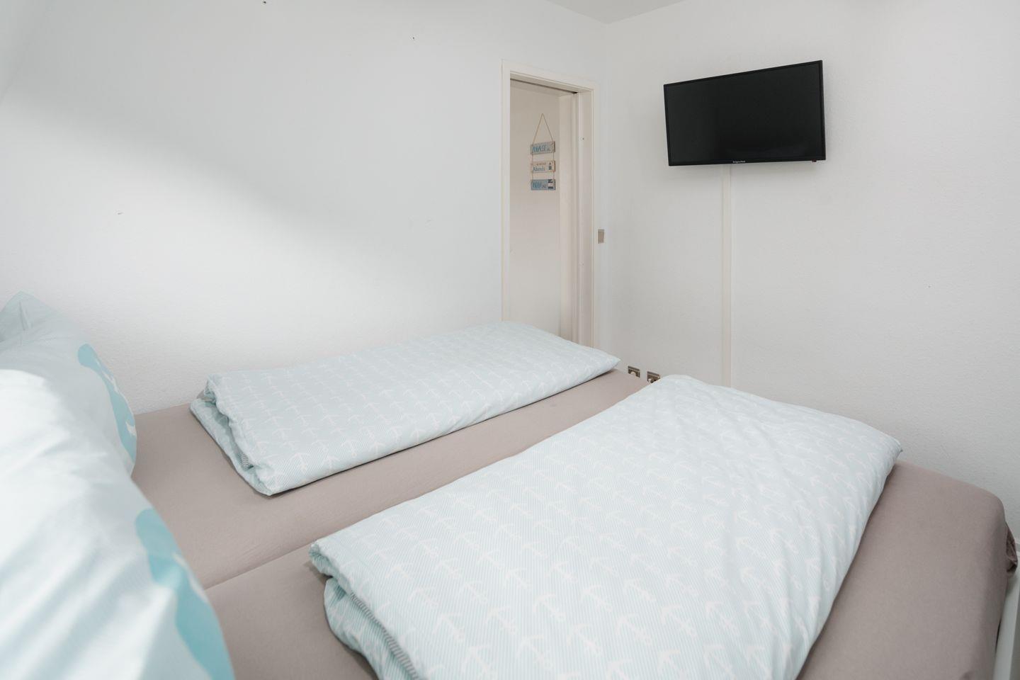 Die Ferienwohnung verfügt über ein einladendes Schlafzimmer mit einem komfortablen Bett (160x200cm), in dem Sie nach einem ereignisreichen Tag entspannt zur Ruhe kommen können. Der Raum ist hell und freundlich, sodass Sie sich sofort wohlfühlen werden.
