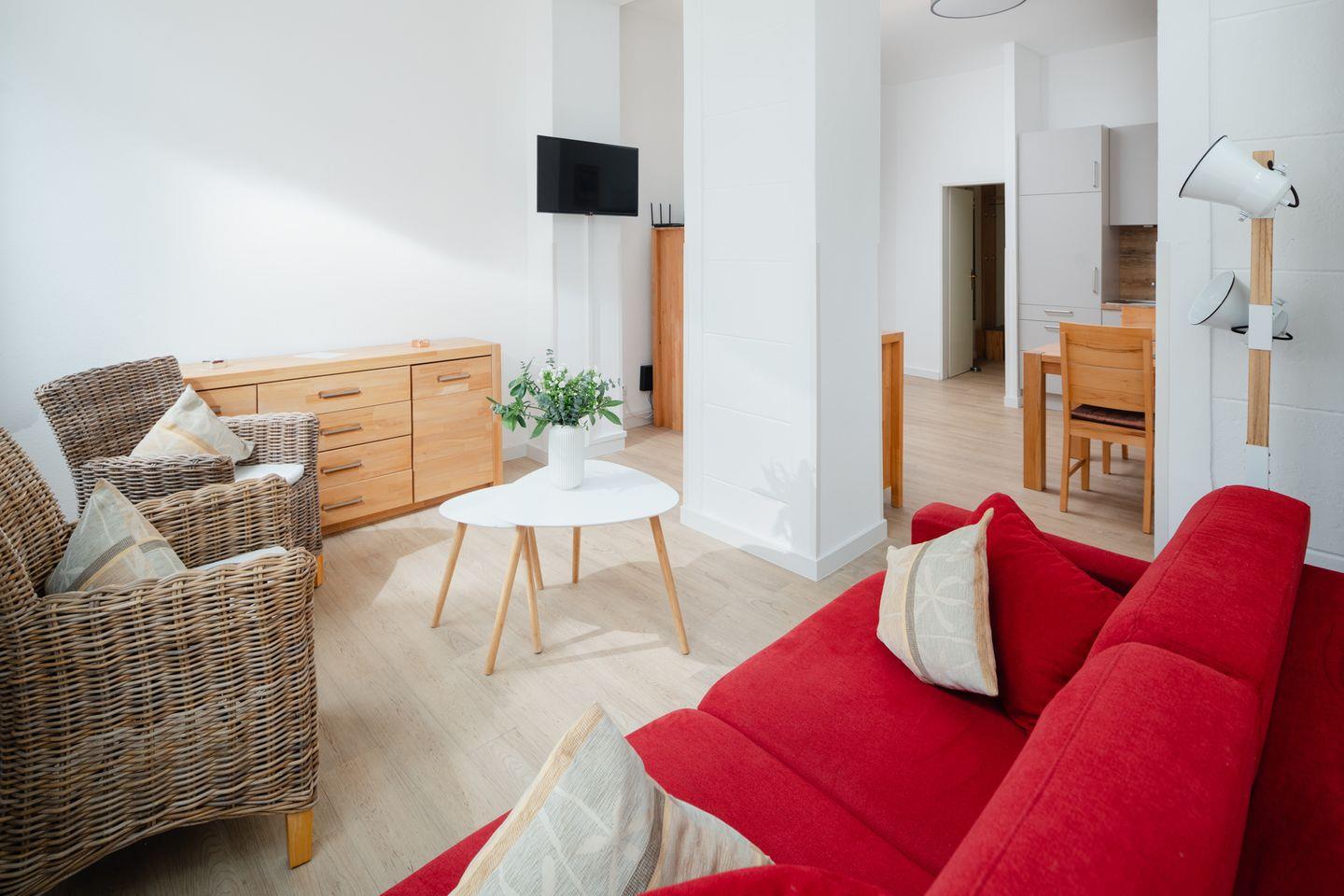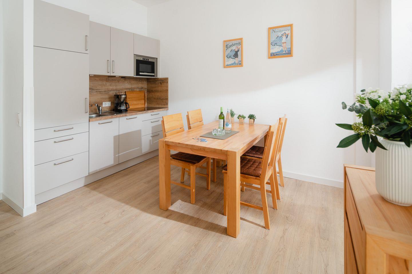 Genießen Sie die gemütliche Atmosphäre der hellen Räume, die mit Vinyl-Bodenbelägen ausgestattet sind. Das Wohnzimmer lädt mit einem komfortablen Sofa, einem Fernseher (35-44 Zoll) und einer kleinen Auswahl an Büchern und Spielen zum Verweilen ein. Von hier aus gelangen Sie in die offene, voll ausgestattete Küche, die mit einem Ceran-Herd, einer Mikrowelle, einer Spülmaschine und allem notwendigen Kücheninventar ideal für die Zubereitung köstlicher Mahlzeiten ausgestattet ist. Der Essbereich der Ferienwohnung ist perfekt zum gemeinsamen Essen und Plaudern geeignet.
