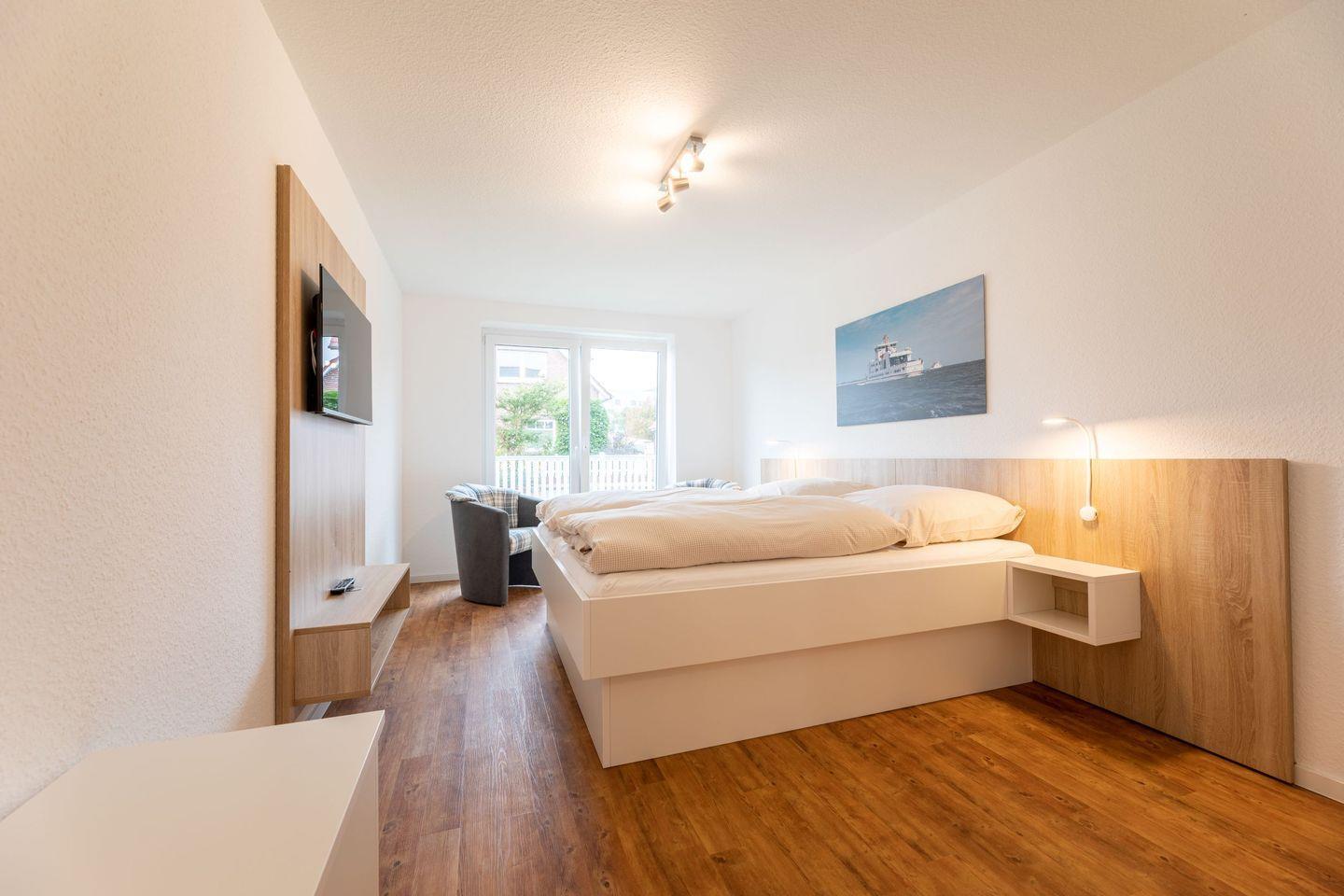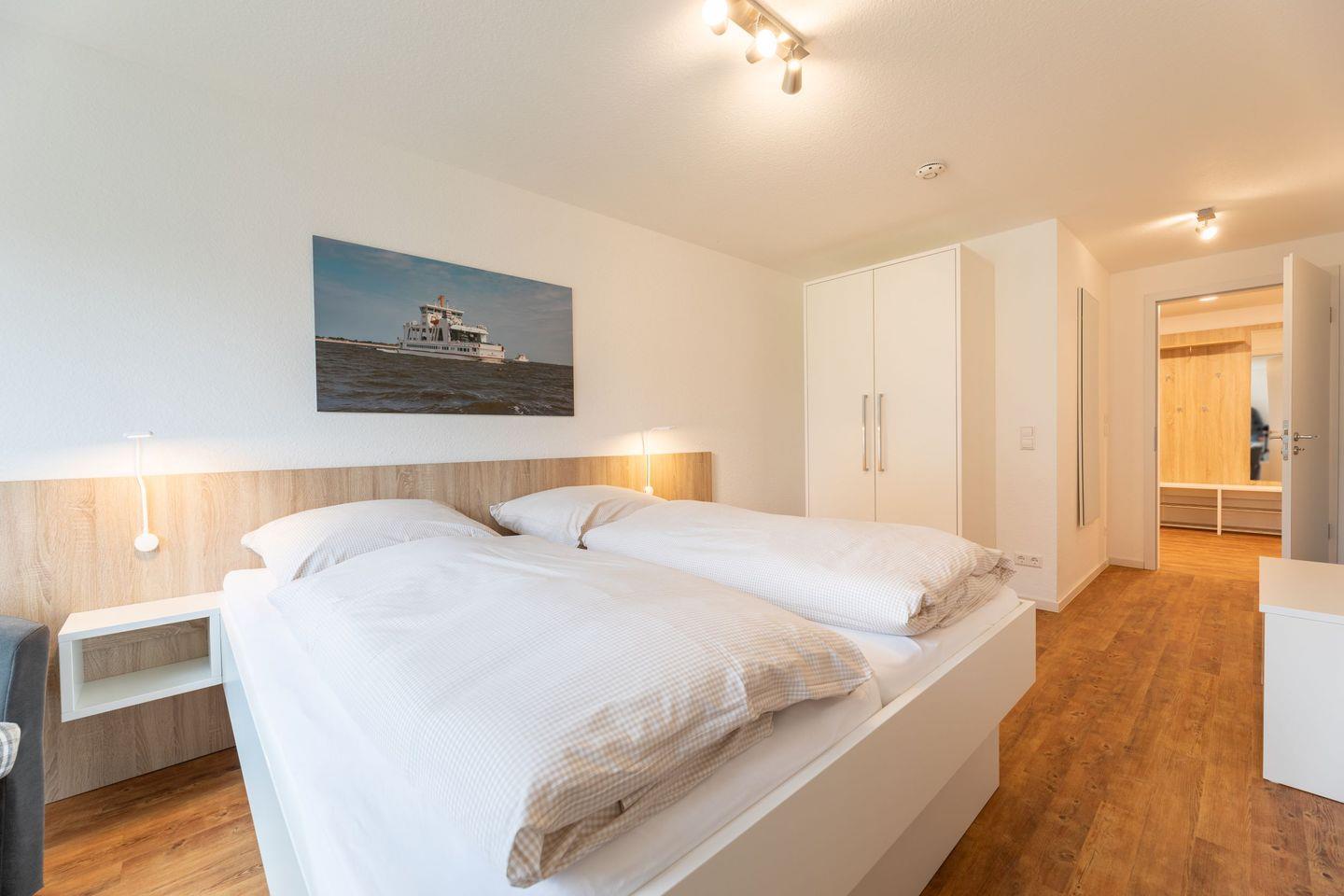 Zwei separate Schlafzimmer befinden sich in der Wohnung. Eingerichtet ist das Elternschlafzimmer mit 1 Doppelbett (1,80 x 2,00m), Kleiderschrank und einer gemütlichen Sitzecke mit zwei Cocktailsesseln sowie einen Flachbildschirm TV & Radio. Im Kinderzimmer befinden sich zwei hintereinanderstehenden Einzelbetten (0,90 x 2,00m), Kleiderschrank, Schreibtisch und ein Flachbildschirm TV & Radio. Für einen erholsamen Urlaubsschlaf sind die Lattenroste der Betten am Kopf- wie Fußende höhenverstellbar. Eine dritte Schlafmöglichkeit bietet im Wohnraum ein bequemes Schlafsofa mit Lattenrost, leicht zu bedienen und auszuziehen. Die Wohnung bietet Platz für bis zu 6 Personen.