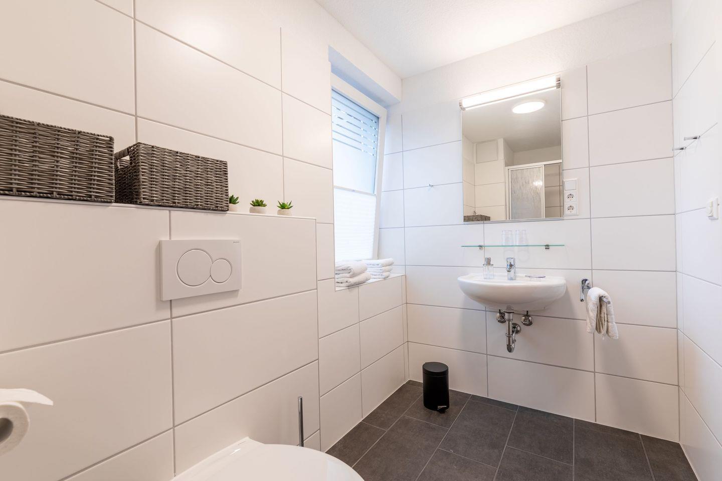Das helle moderne Badezimmer ist mit Dusche / WC ausgestattet.