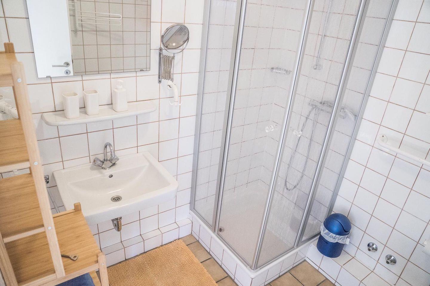 Das helle Badezimmer ist mit einer Dusche, WC und einem Haartrockner ausgestattet – praktisch und funktional.