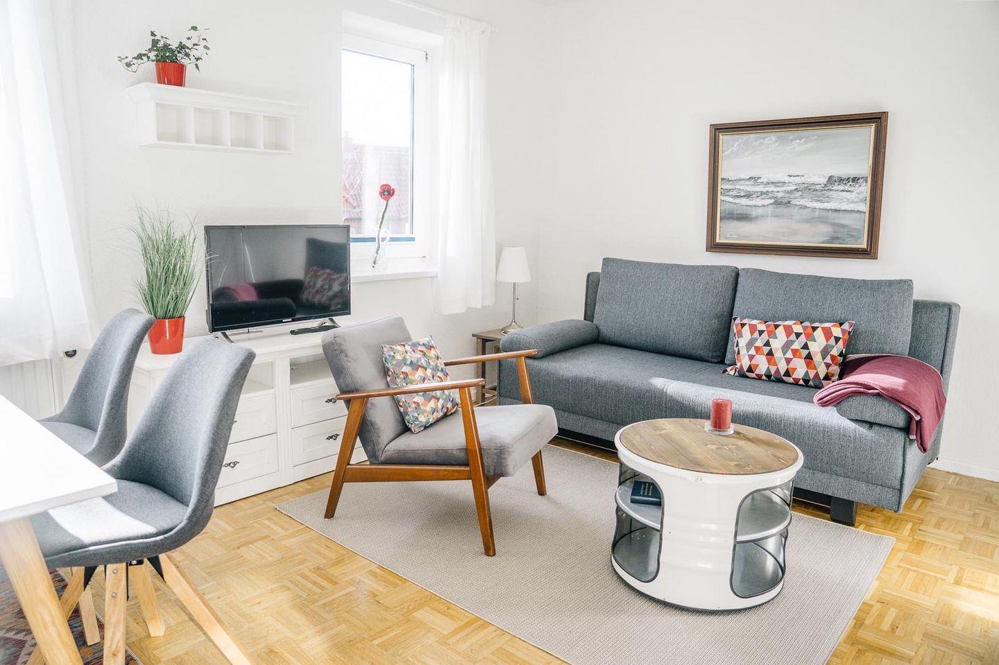 Die Wohnung verfügt über ein separates Schlafzimmer mit einem komfortablen Doppelbett – perfekt für erholsame Nächte. Der Wohnbereich ist gemütlich eingerichtet und lädt mit einem TV, Radio und einem ausziehbaren Sofa zum Entspannen ein. Das Sofa lässt sich schnell und unkompliziert in eine bequeme Schlafgelegenheit für zwei weitere Personen verwandeln.