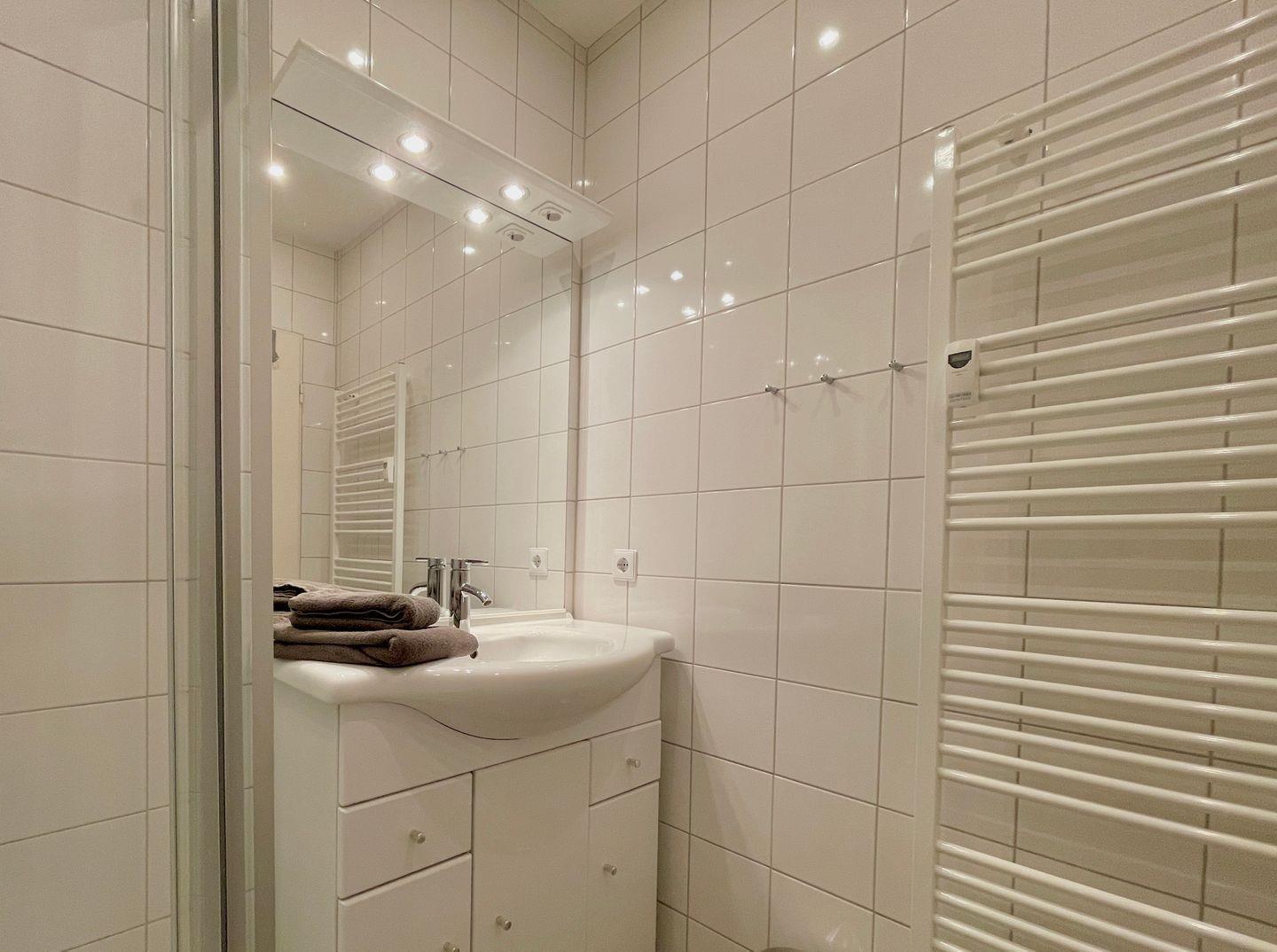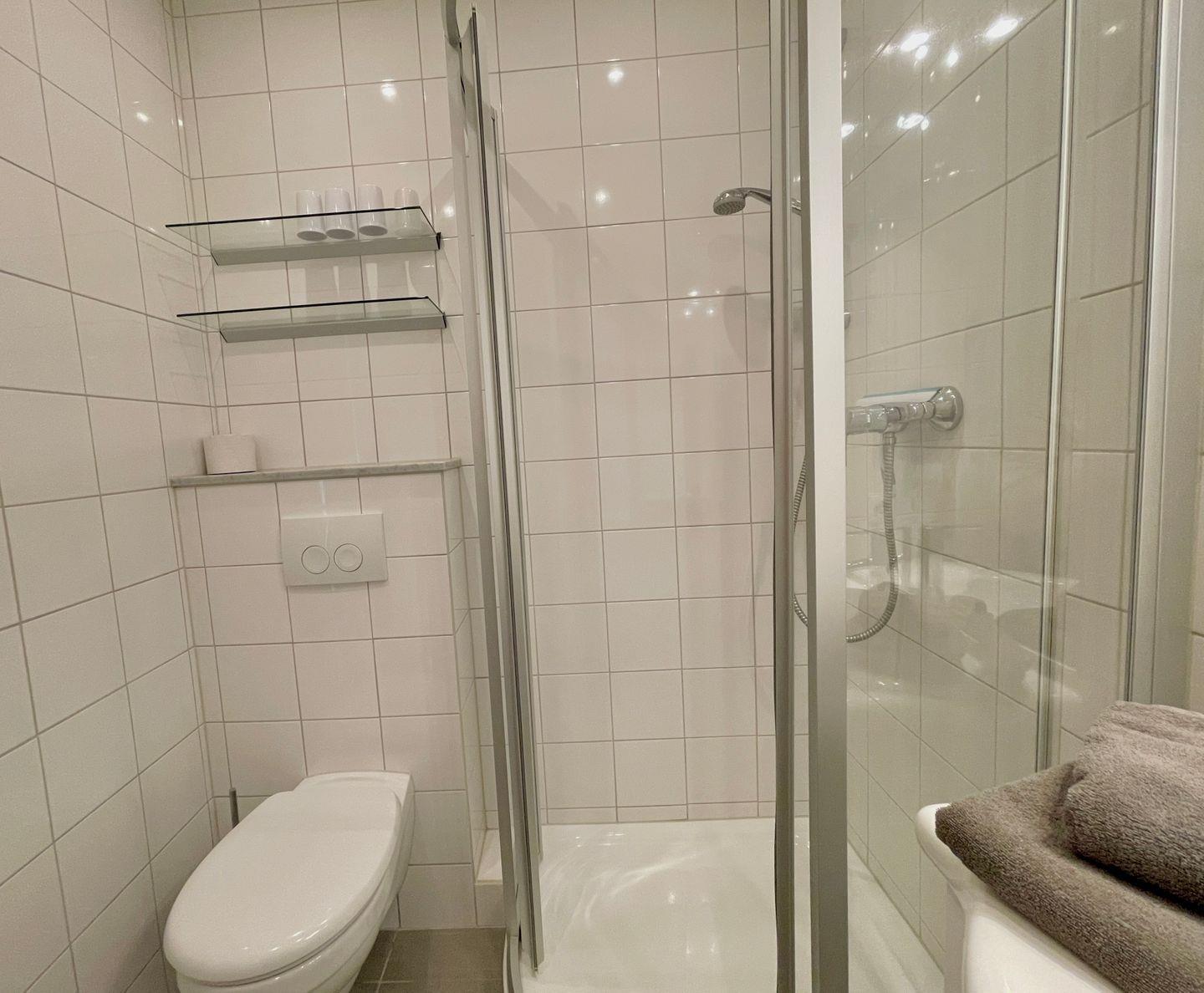 Das Badezimmer verfügt über eine Dusche und ein WC.