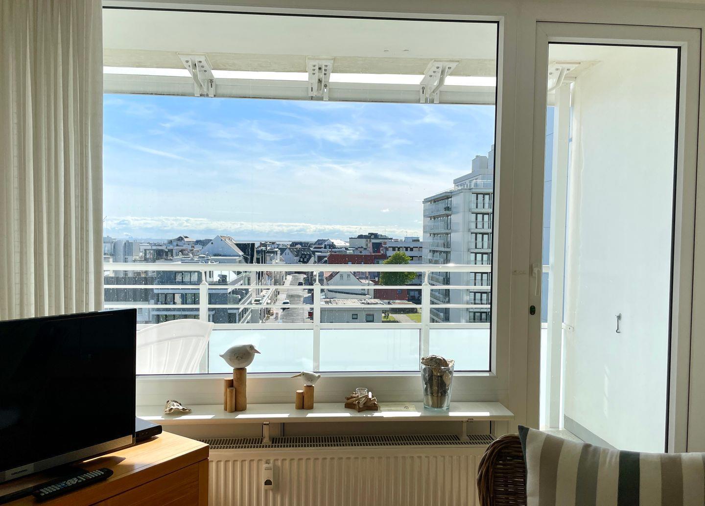 Diese, direkt am Meer gelegene Wohnung befindet sich im 5. Obergeschoss und bietet vom Sonnenbalkon aus einen weiten Blick über die Dächer von Norderney bis hin zur Insel Juist und zum Festland. Seitlich hat man einen direkten Blick aufs offene Meer.