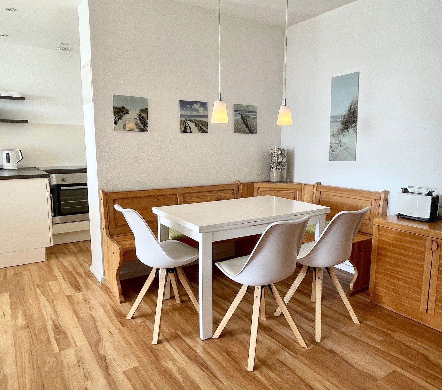 Der offene Wohnbereich umfasst eine moderne, voll ausgestattete Küche mit Kaffeemaschine, Espressomaschine, Wasserkocher, Toaster, Herd mit Ceran-Kochfeld, Backofen, großem Kühlschrank und Geschirrspüler. In der großzügigen Essecke finden bis zu vier Personen ausreichend Platz für gemeinsame Mahlzeiten oder gemütliche Spielrunden.